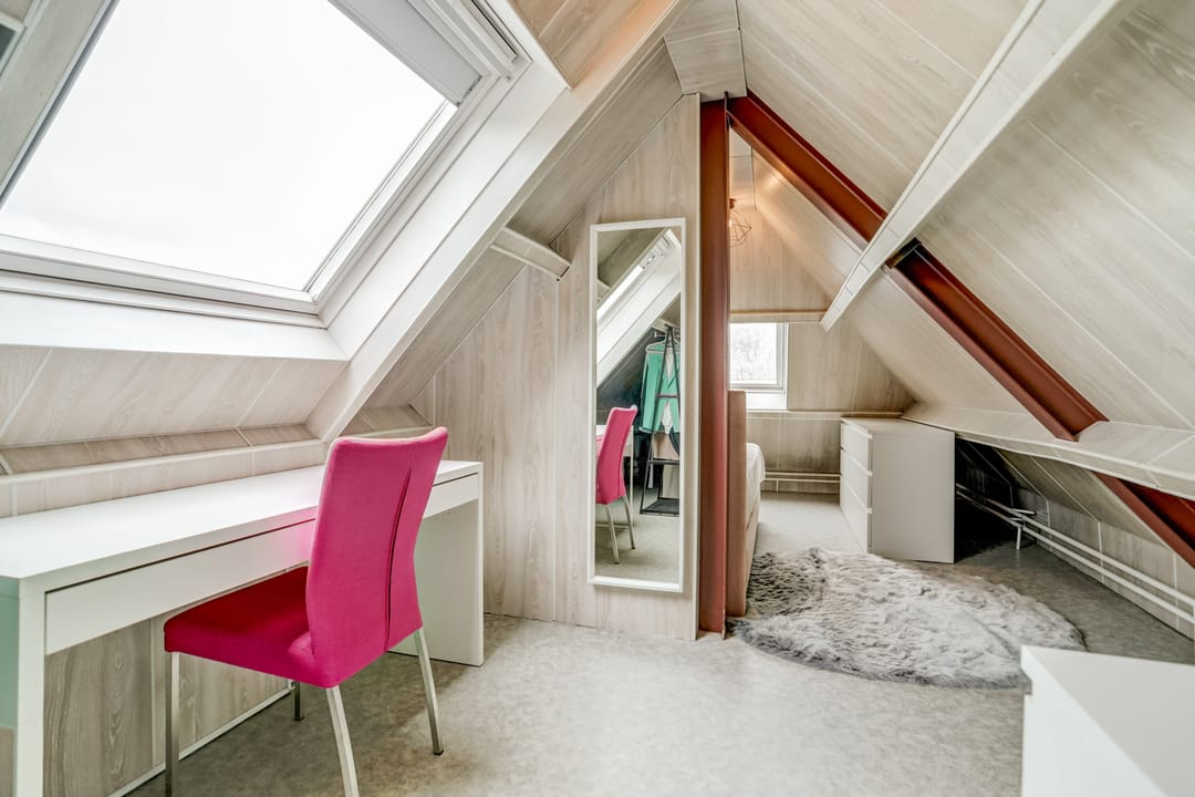 Zodra je de trap oploopt, loop je direct de slaapkamer in, welke voldoende ruimte biedt voor een tweepersoonsbed, bureau en een kledingkast. Tevens beschikt deze ruimte over twee dakramen voor het nodige daglicht en ventilatie.