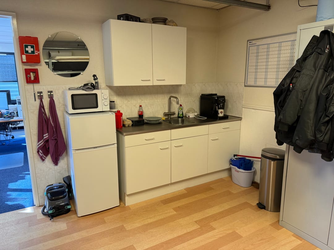 - Overheaddeuren, betonvloer, toilet, pantry, airconditioning en inbouwarmaturen