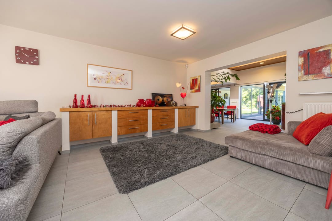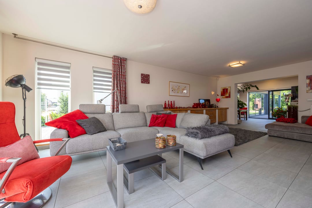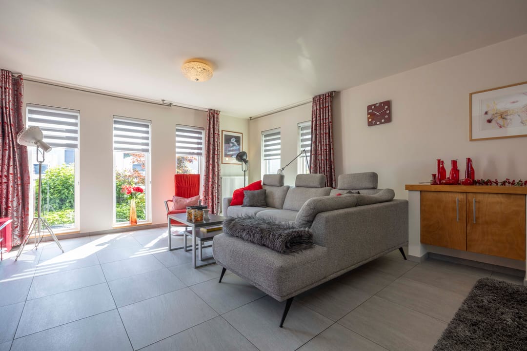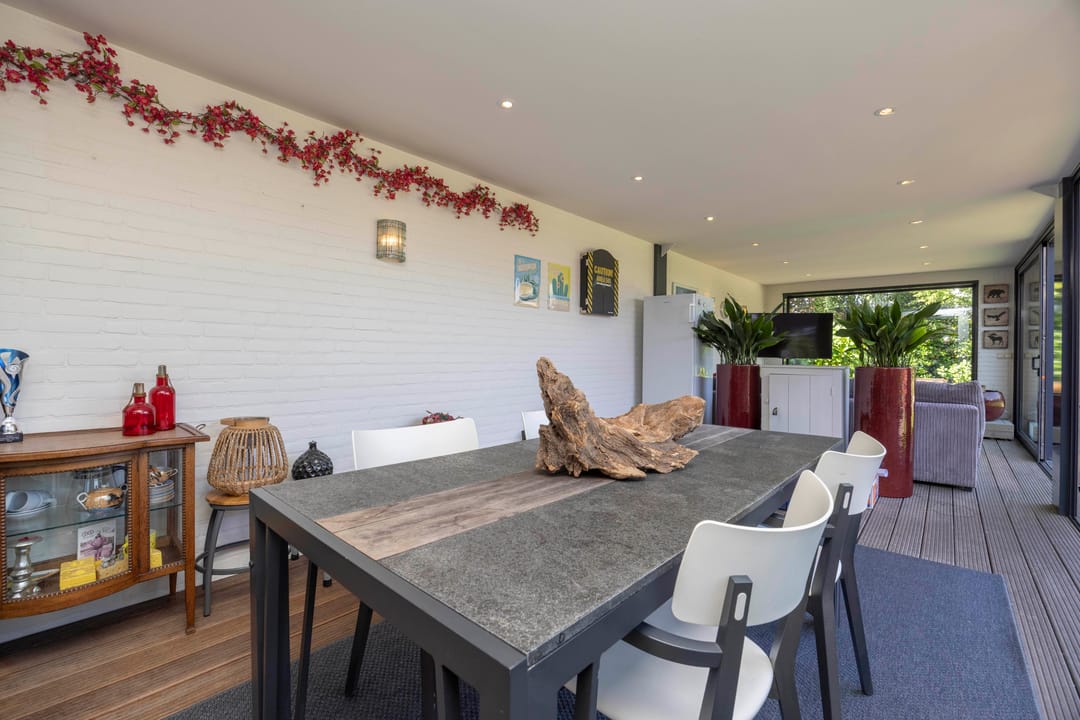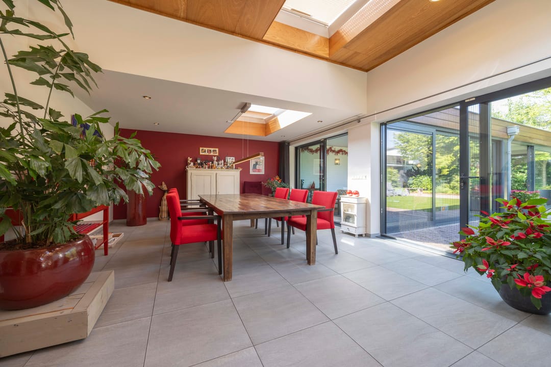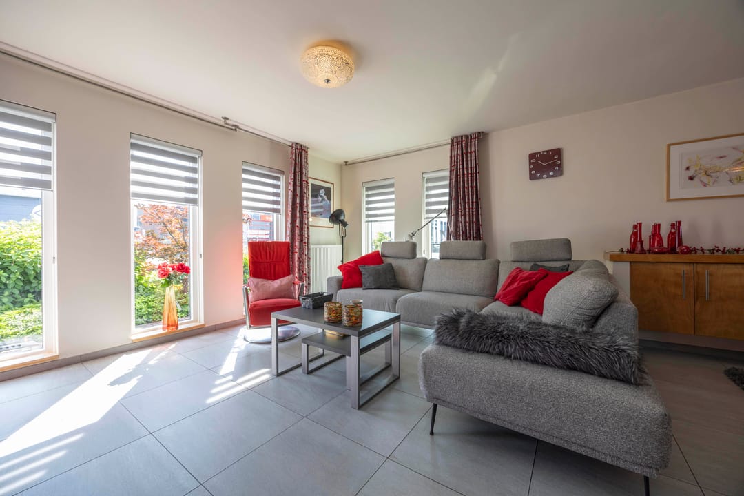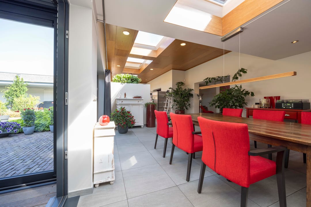 De wanden en het plafonds zijn, net als in de rest van het woonhuis, uitgevoerd met stucwerk. Vanuit de zitkamer heeft u prachtig zicht op de tuin. Op de begane grond ligt een keramische tegelvloer in een lichte grijstint, voorzien van vloerverwarming.