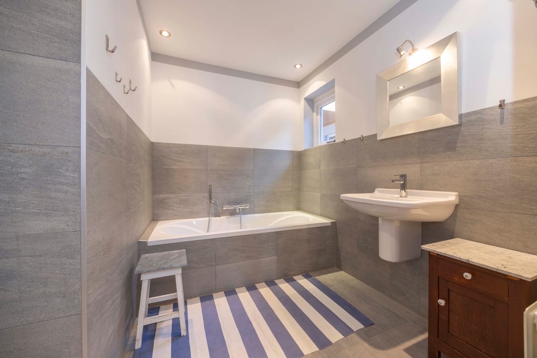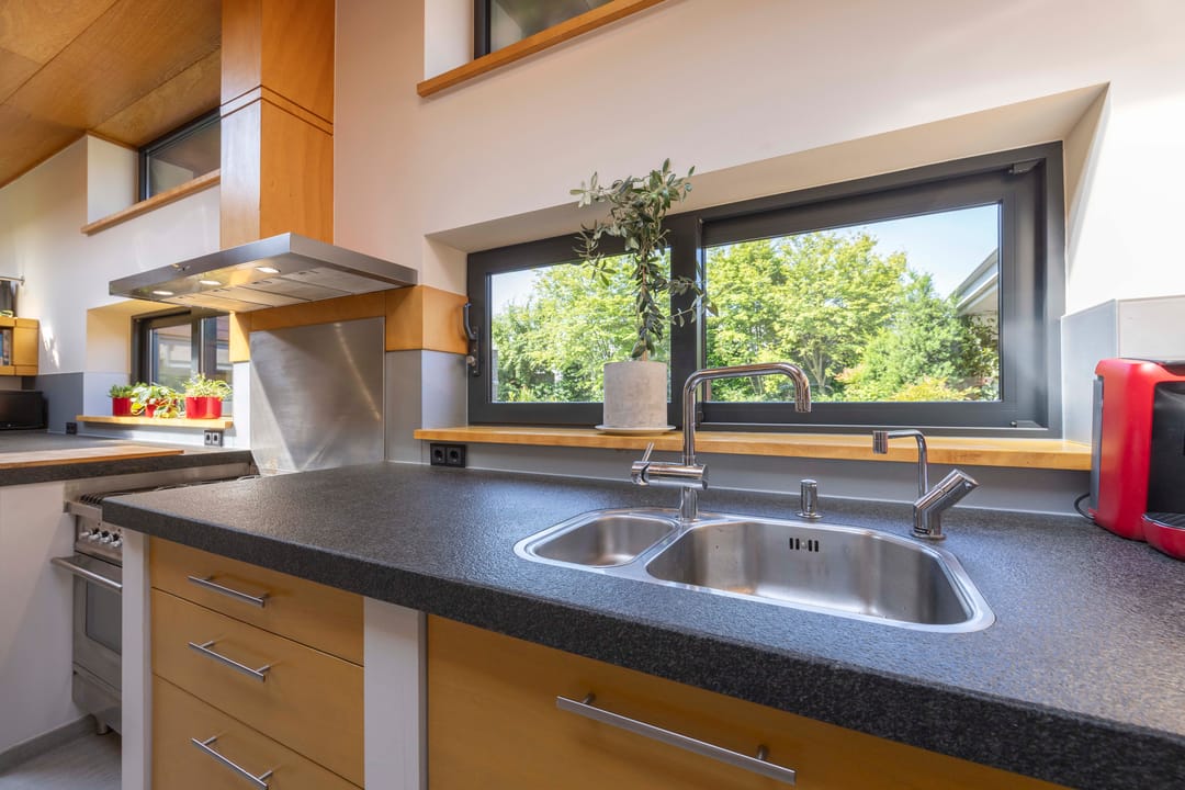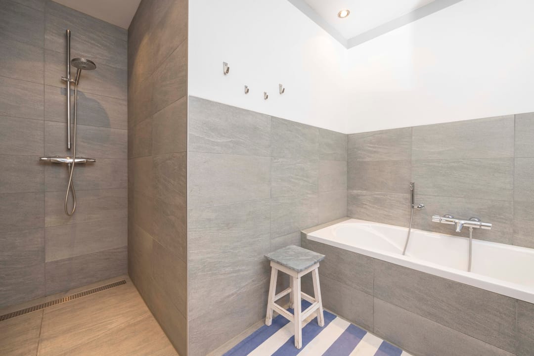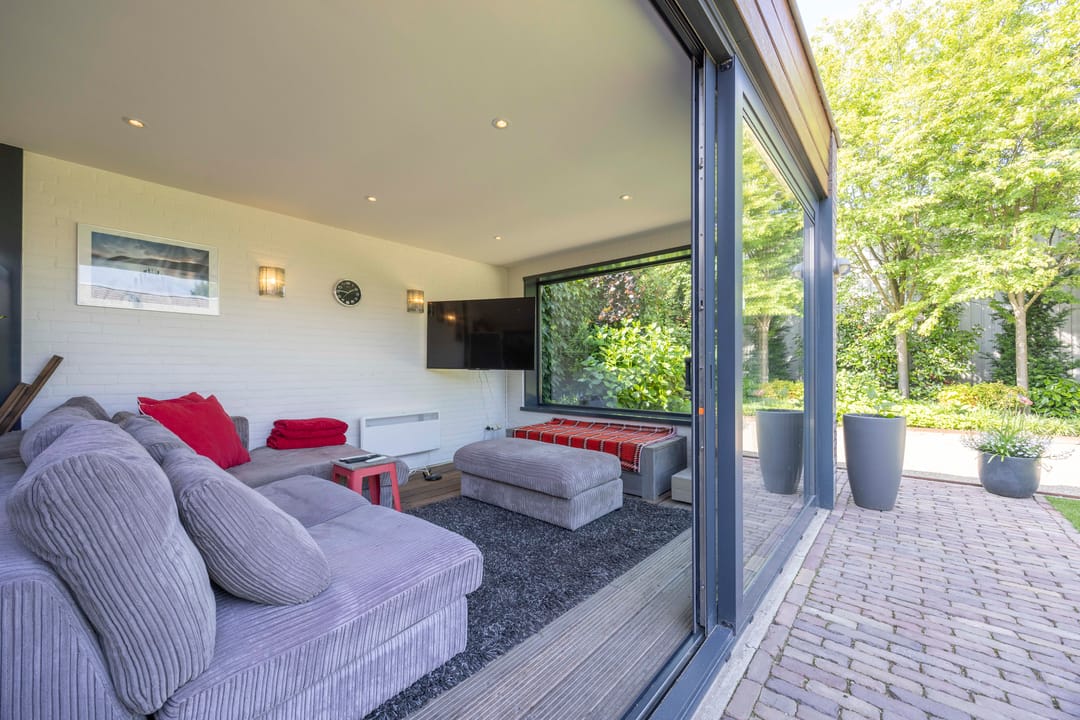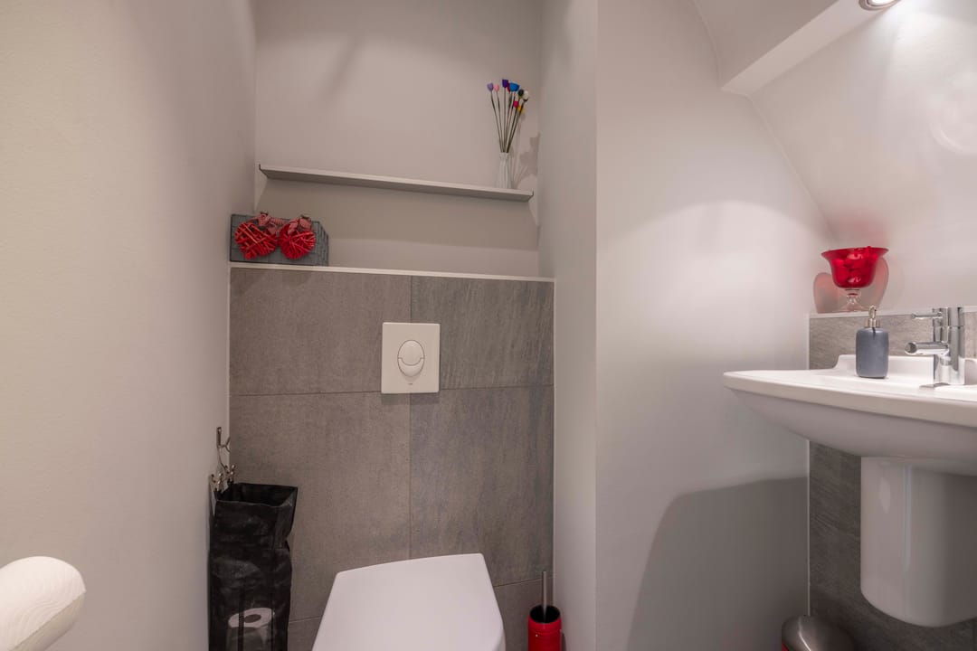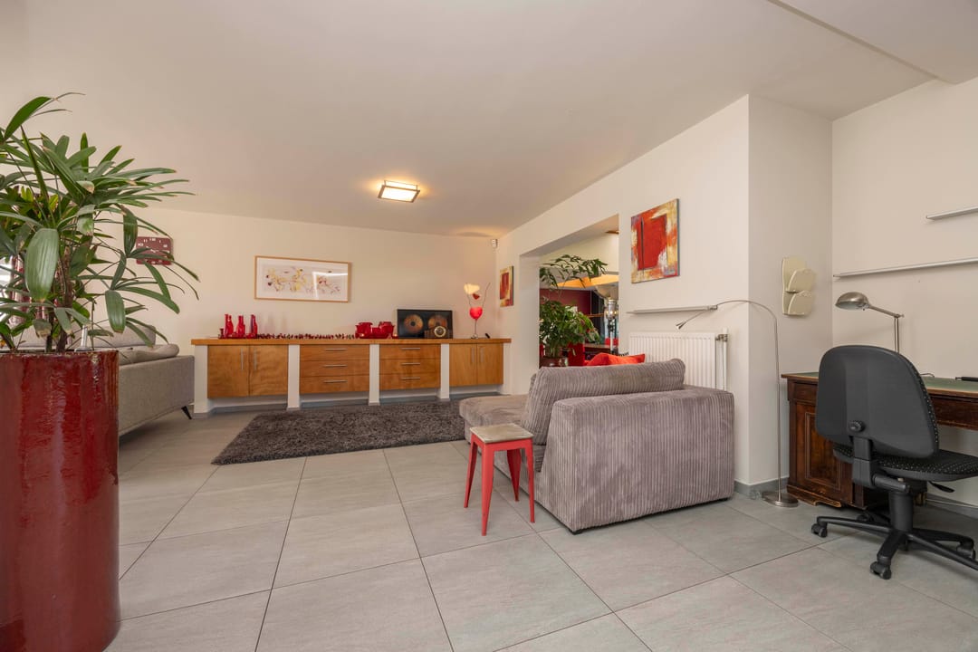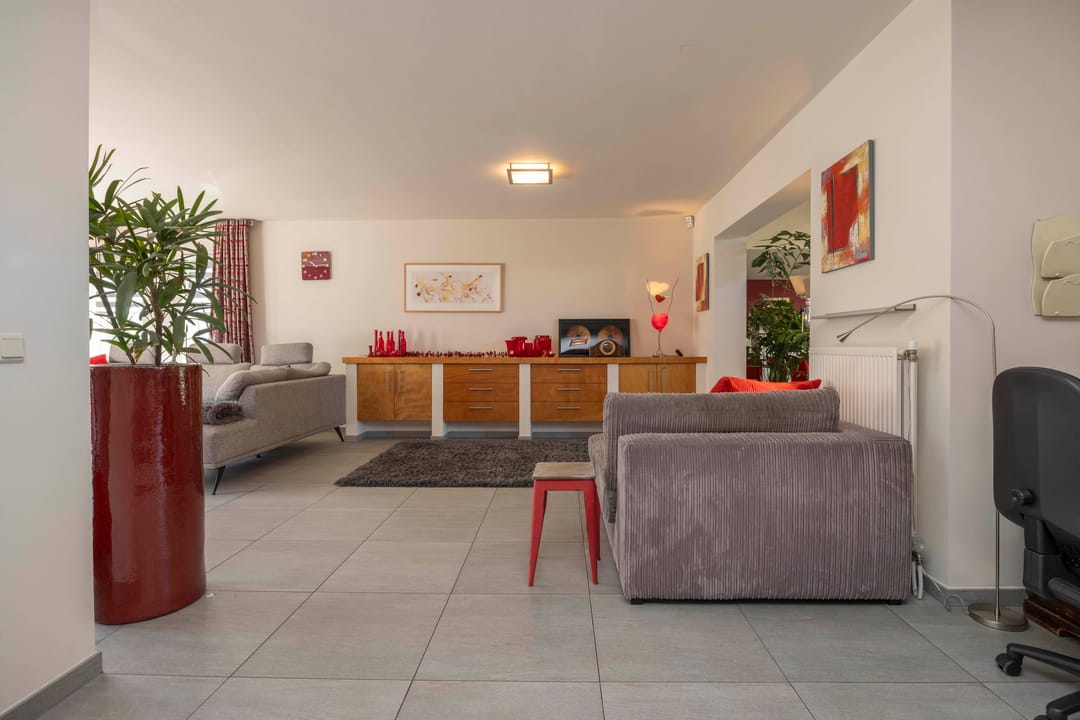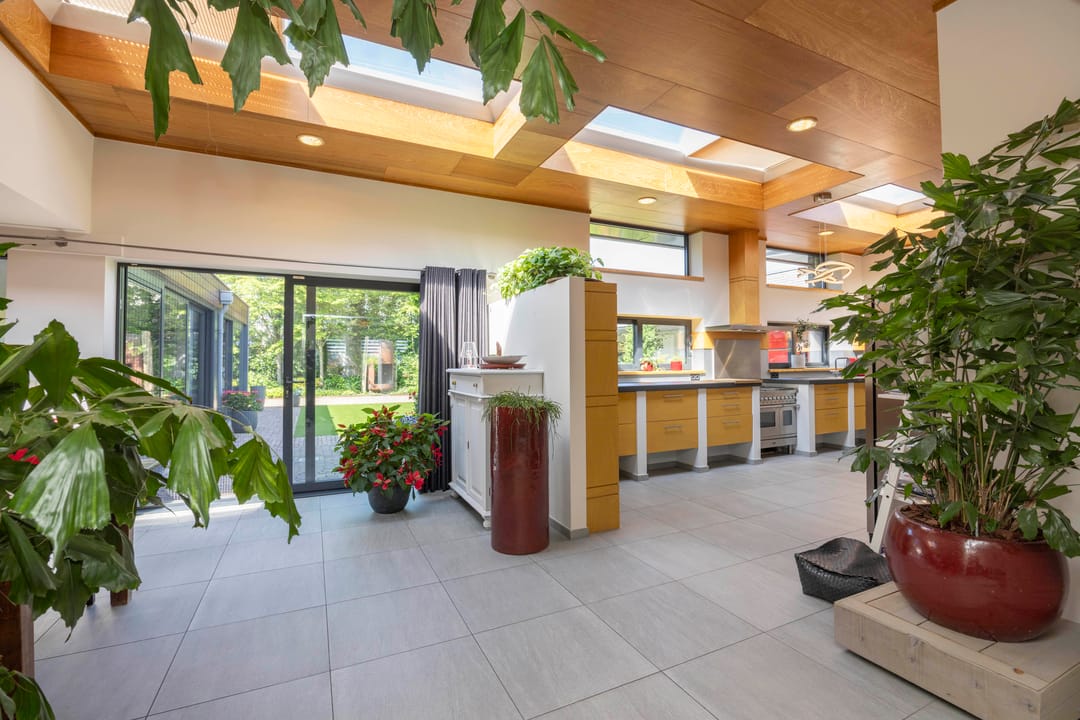 De wanden en het plafonds zijn, net als in de rest van het woonhuis, uitgevoerd met stucwerk. Vanuit de zitkamer heeft u prachtig zicht op de tuin. Op de begane grond ligt een keramische tegelvloer in een lichte grijstint, voorzien van vloerverwarming.
