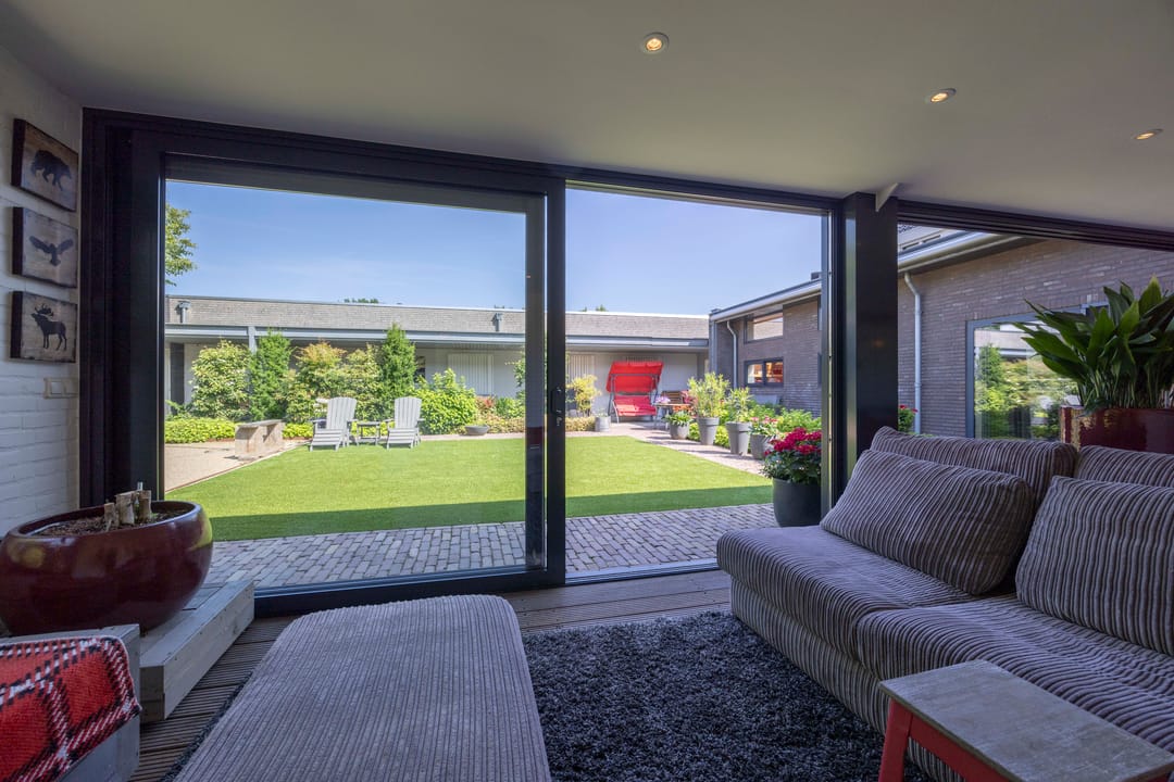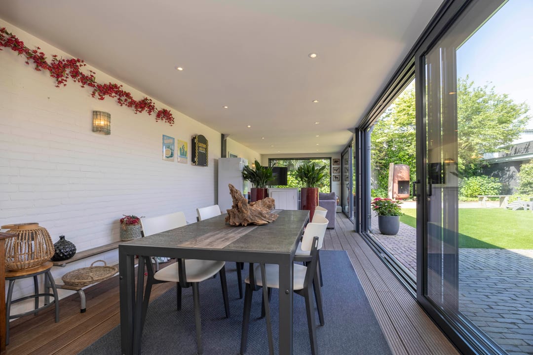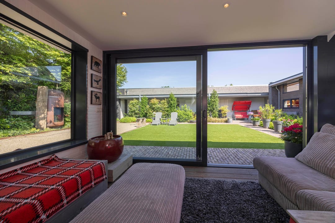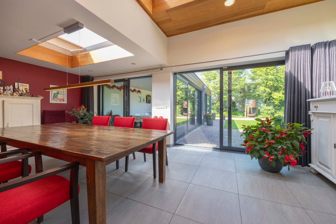 Entree naar hal met trapopgang, toilet en meterkast. Vanuit de hal toegang tot de woonkamer. De woonkamer bestaat uit twee delen; een zitkamer aan de voorzijde van het woonhuis en een eetkamer aan de tuinzijde. De vele raampartijen zorgen voor een prettige hoeveelheid daglicht in de woonkamer en de rest van het huis. In de eetkamer een schuifpui naar het terras en schuifpui naar de tuinkamer. Het eetgedeelte staat in open verbinding met de keuken. Het centraal gepositioneerde 6-pits gasfornuis (Boretti) met afzuigschouw is de eyecatcher in deze keuken. Aan weerszijden van het gasfornuis twee grote granieten werkbladen met daaronder op maat gemaakte ladekasten. In een van de werkbladen een spoelgedeelte met heetwaterkraan (Quooker). Vanuit de keuken fraai uitzicht over de tuin. Aansluitend aan de keuken een ruime berging. In deze berging een vaste kast met opstelling cv-installatie en een extra wasmachineaansluiting. Vanuit de keuken toegang tot het bedrijfsgedeelte/ruimte. Verder op de begane grond een ouderslaapkamer met badkamer en-suite De badkamer is voorzien van een ligbad en wastafel.