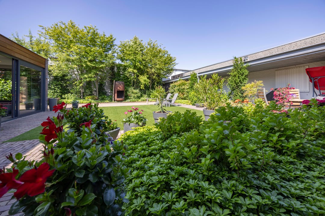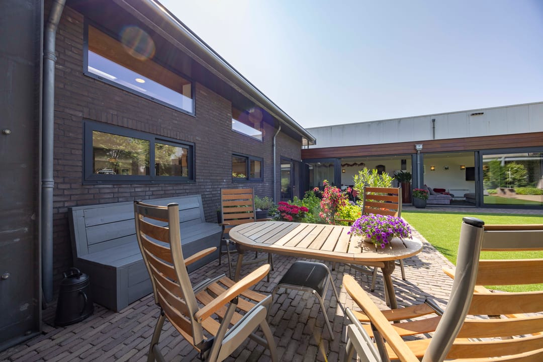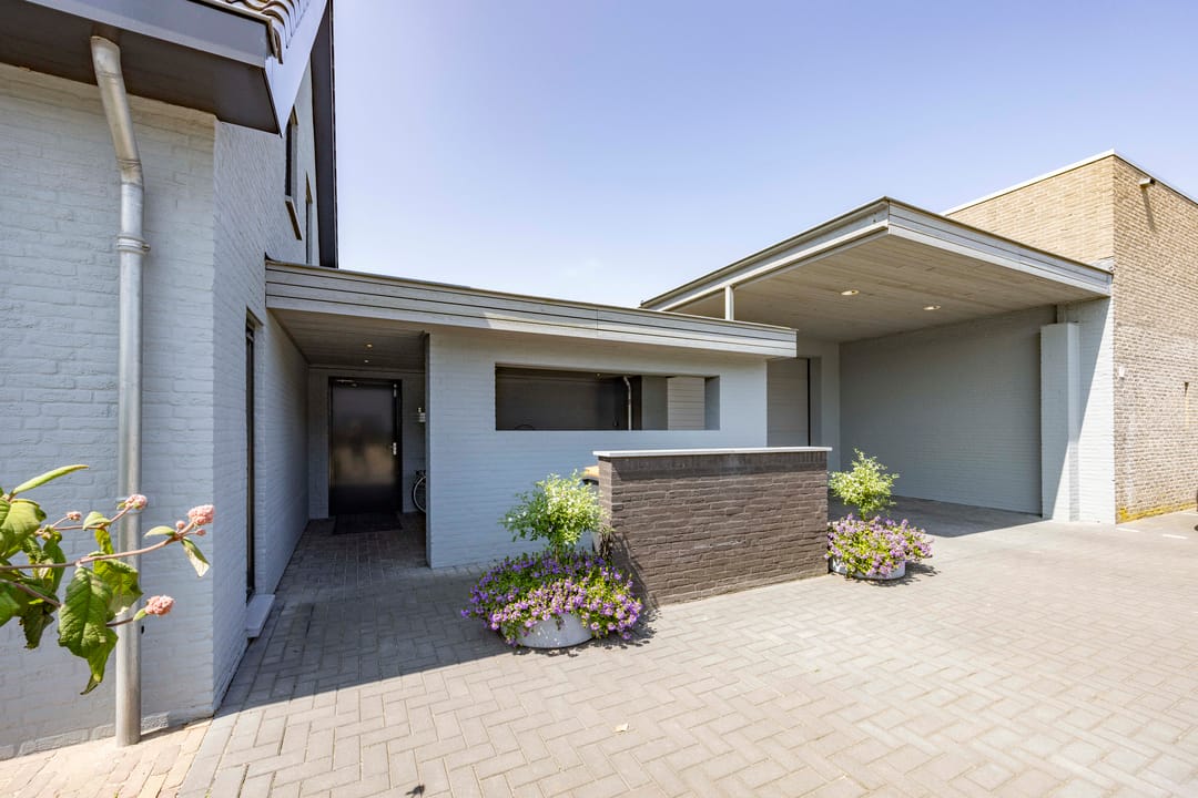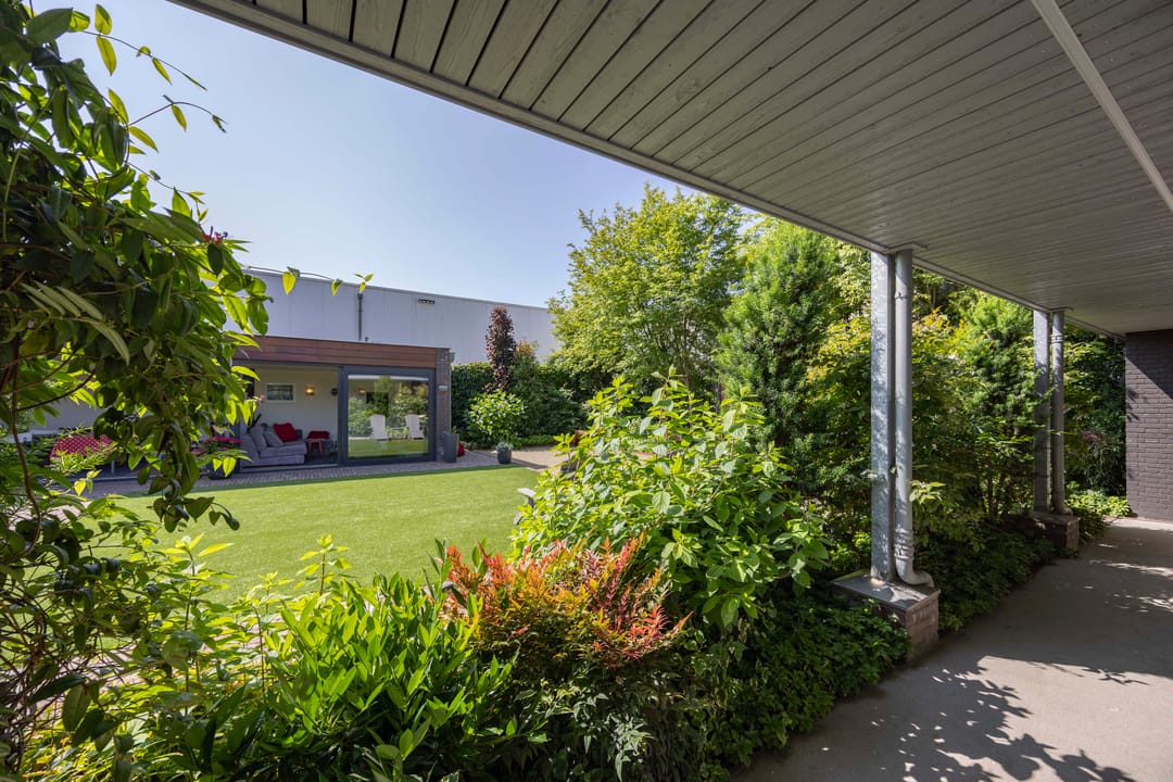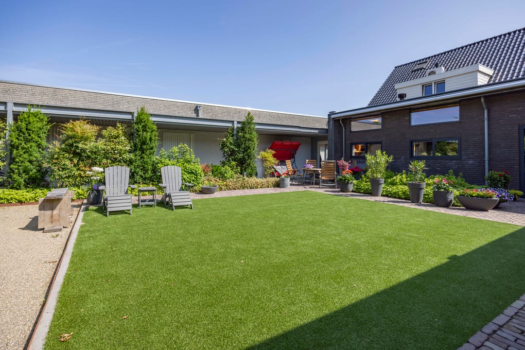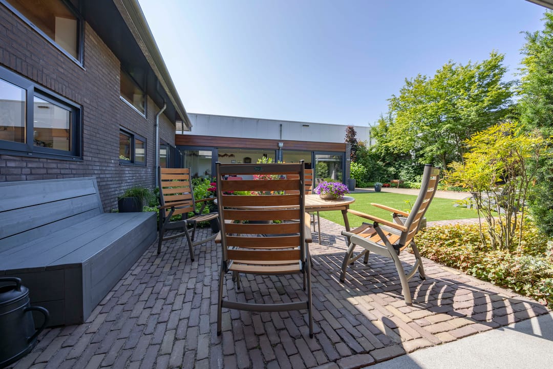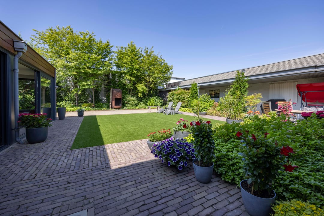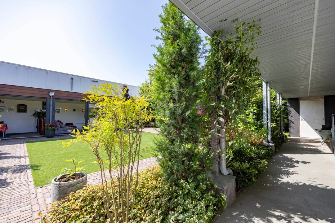 Aan de voorzijde een onderhoudsvriendelijke voortuin. Links naast de woning een oprit naar de carport en een achterom naar de achtertuin. De situering van het woonhuis op het perceel is ruimtelijk. De achtertuin biedt voldoende privacy heeft een terras direct achter het woonhuis met een zonnescherm over de volle breedte en een overdekt terras grenzend aan de bedrijfsruimte. De volwassen bomen, borders en planten maken de tuin tot een aangename verblijfsruimte.