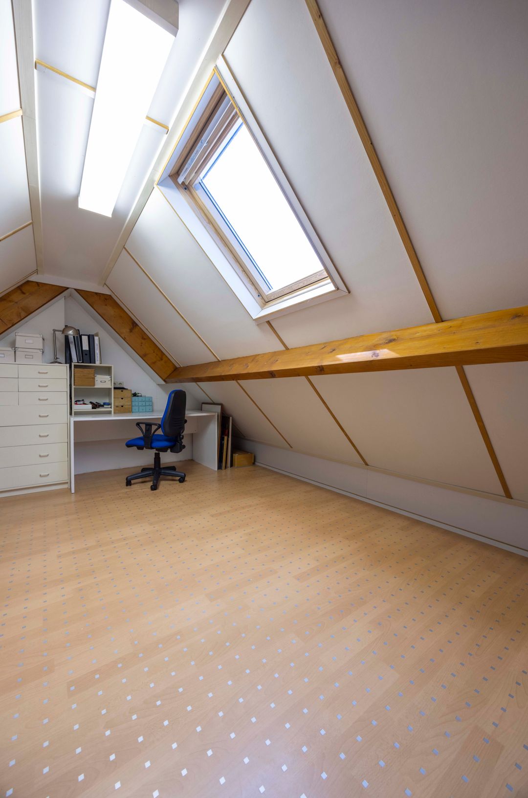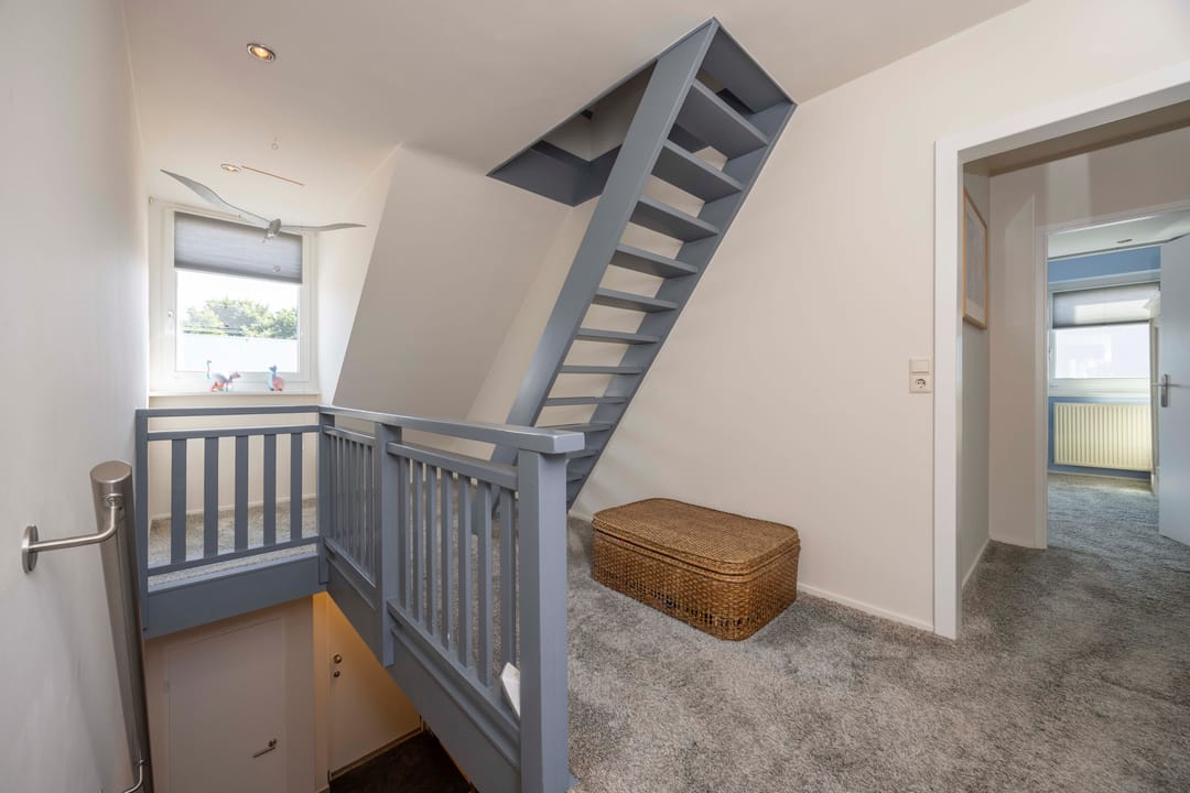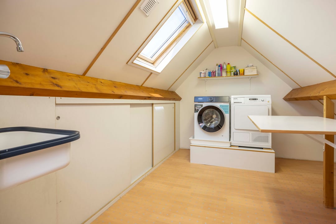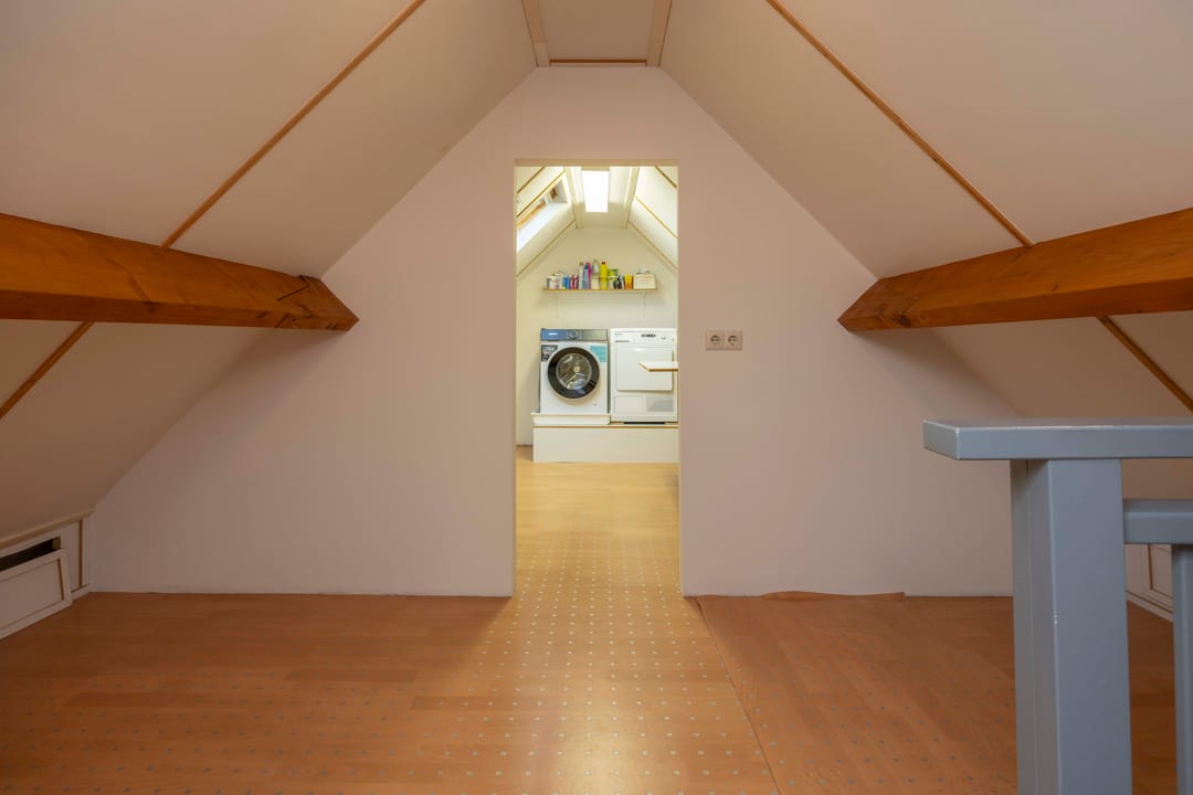 Op de overloop een vaste trap naar ruime bergzolder met twee legramen. Hier bevinden zich ook de aansluitingen voor de wasmachine en droger.