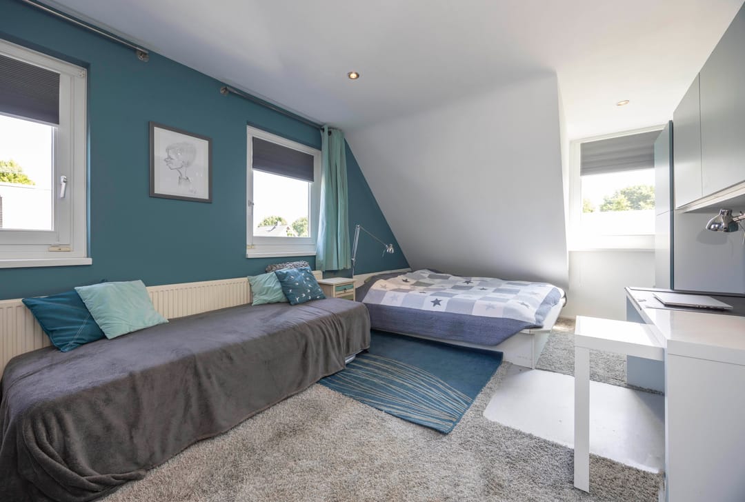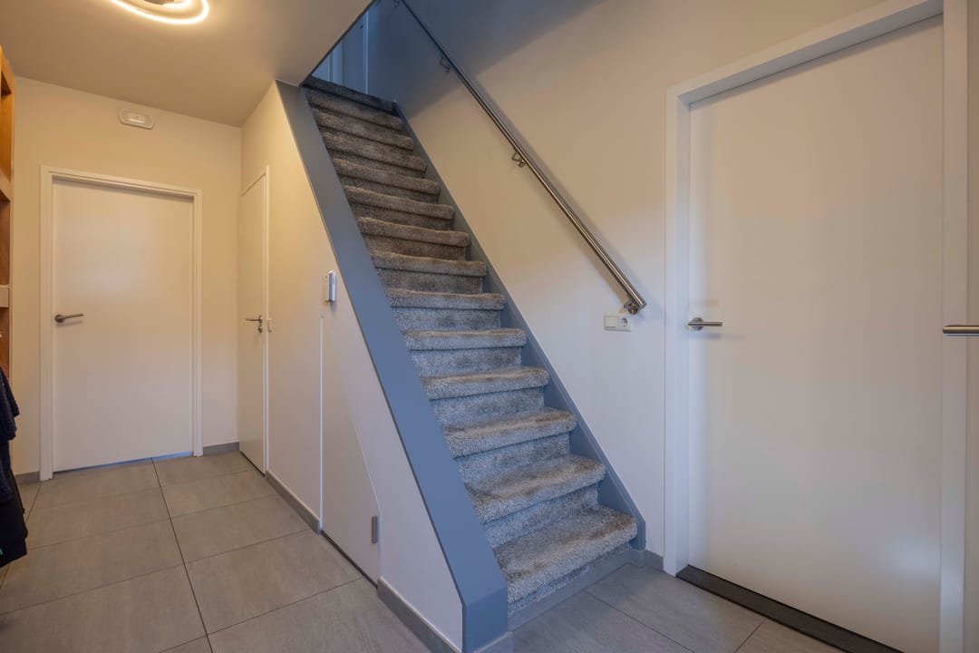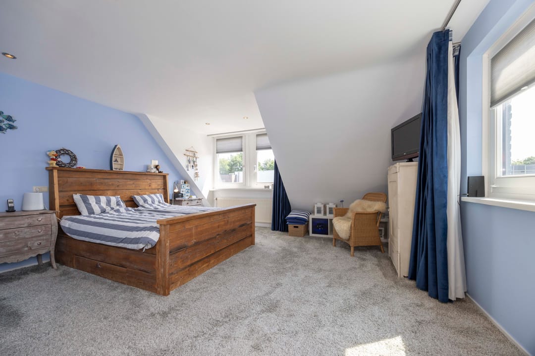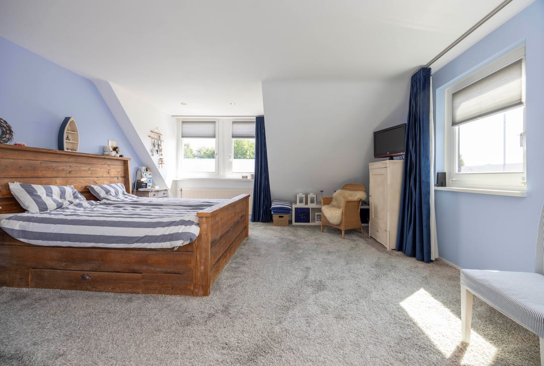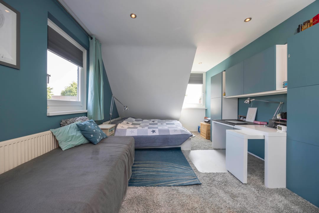 Op de overloop een vaste trap naar ruime bergzolder met twee legramen. Hier bevinden zich ook de aansluitingen voor de wasmachine en droger.