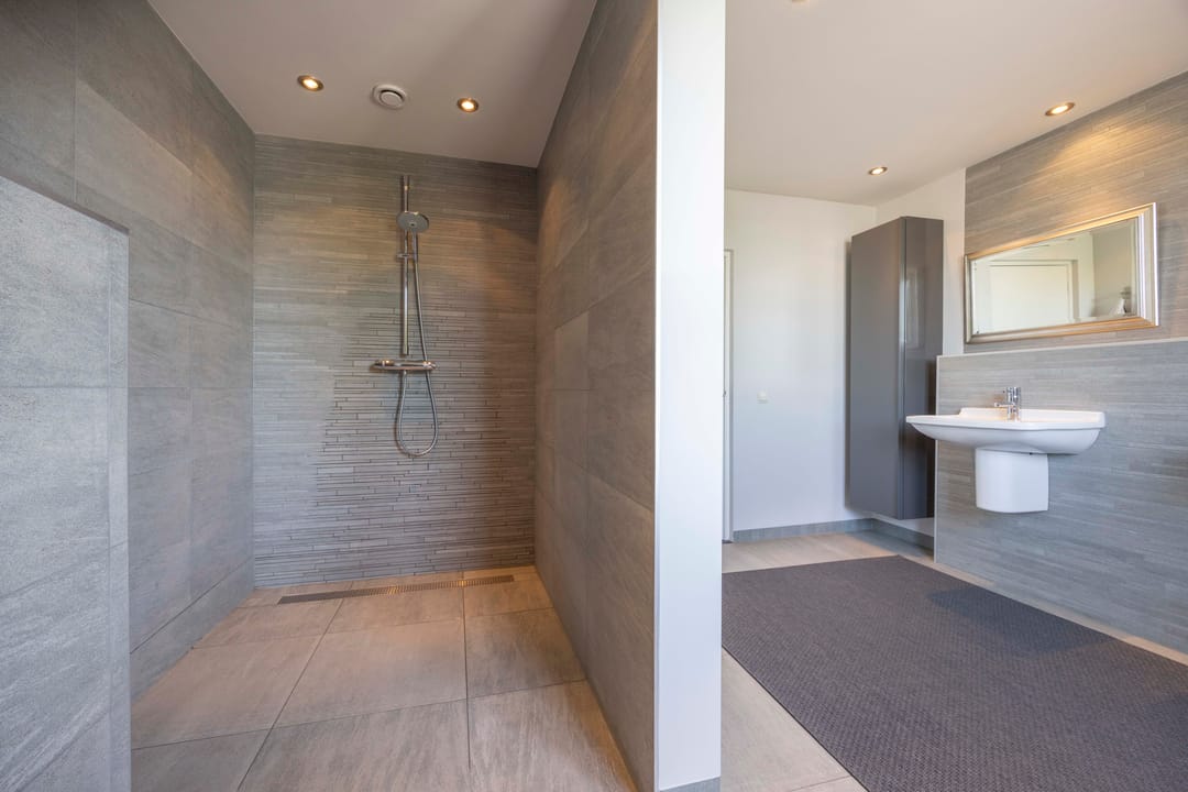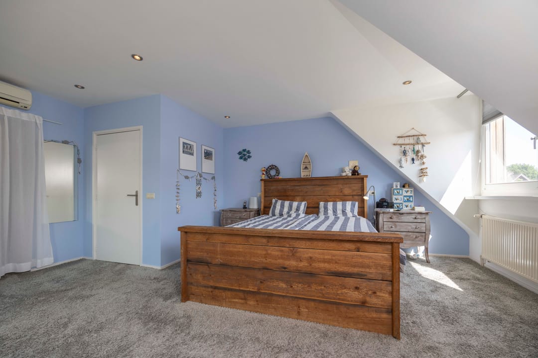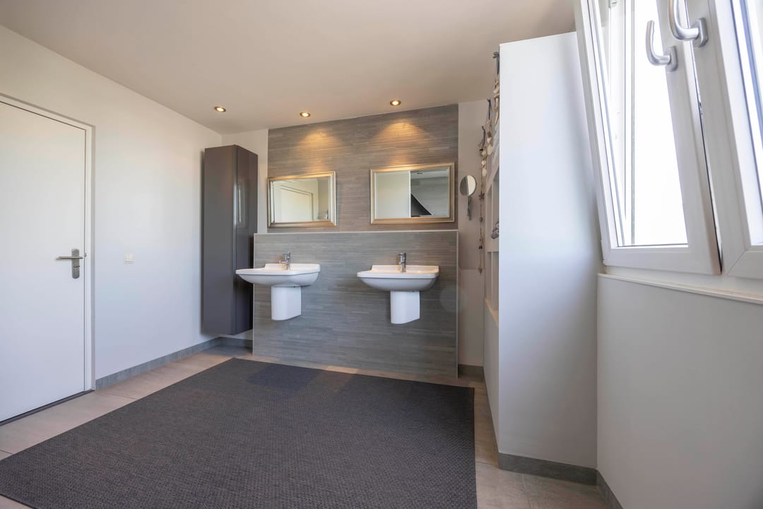 overloop en de slaapkamers zijn voorzien van tapijt. De badkamer op de eerste verdieping is voorzien van een inloopdouche, twee wastafels en toilet.