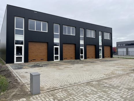 De luxe uitstraling met zwarte sandwichpanelen, een overheaddeur in houtlook en de mogelijkheid voor eigen bedrijfslogo op de gevel maakt dit object een visitekaartje voor uw onderneming.