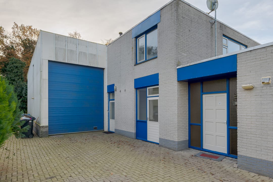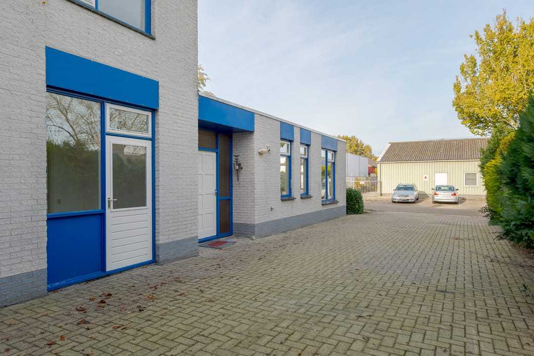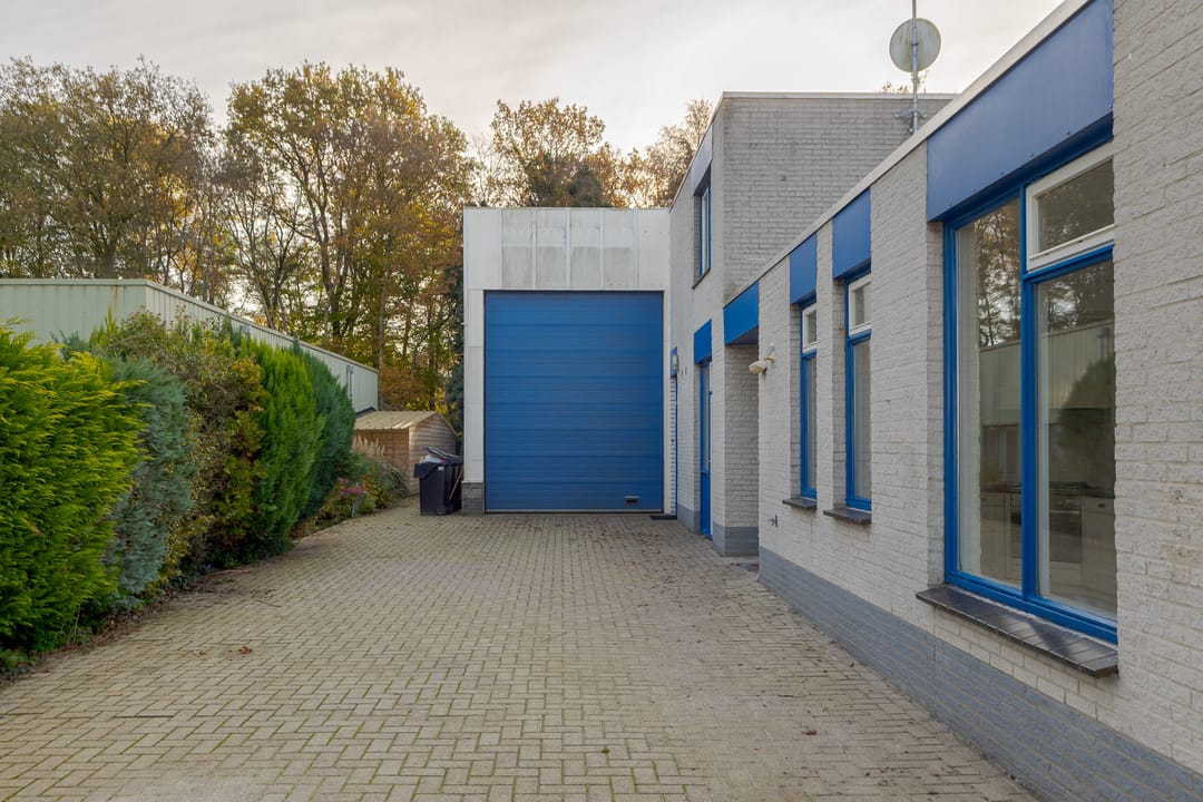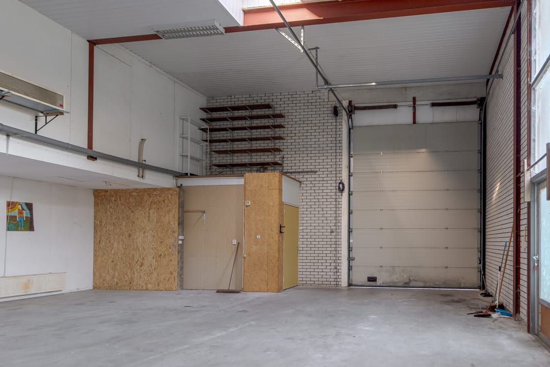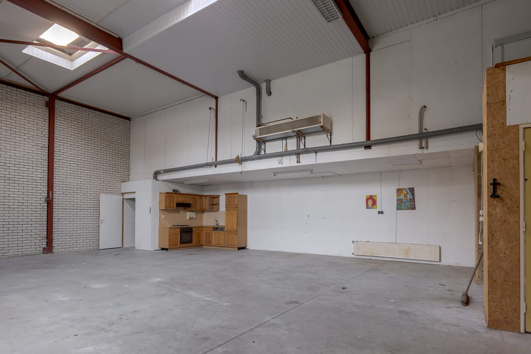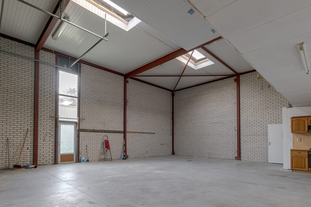 Vanuit de woning loop je binnendoor naar de bedrijfsloods van circa 126 m², voorzien van keukenblok, badkamer en gasheater. De loods heeft een vrije hoogte van bijna 5 meter en een segmentdeur van 4,20 meter hoog. Naast de loods bevindt zich een kantoorruimte met twee kamers, een keukenblok, toilet en badkamer – eventueel ook te gebruiken als extra woonruimte.