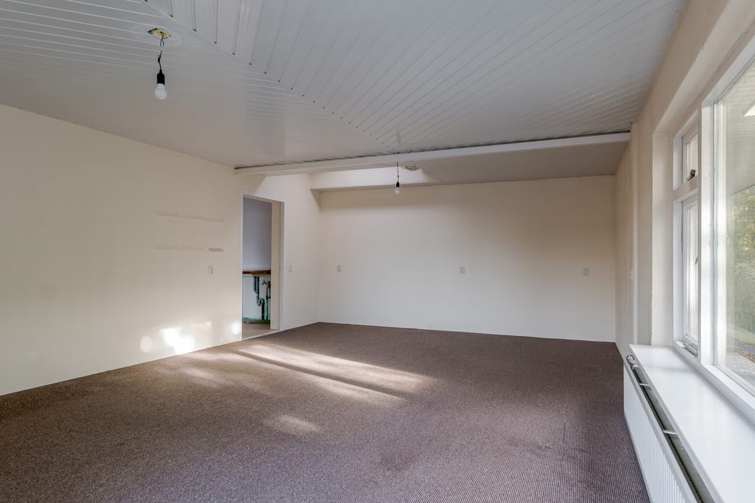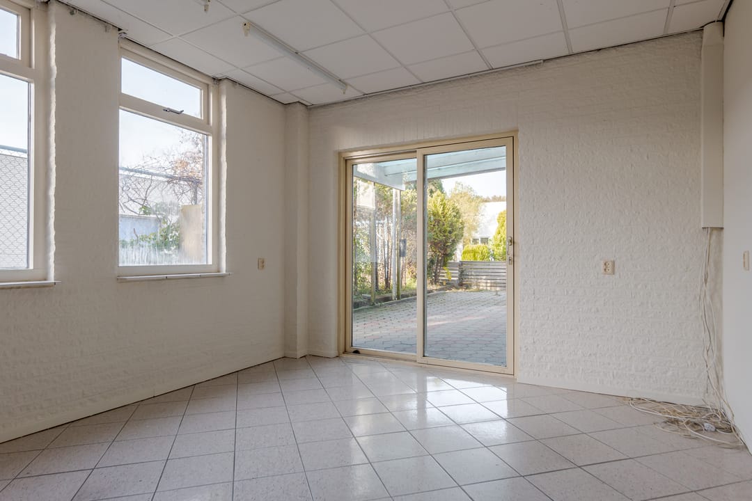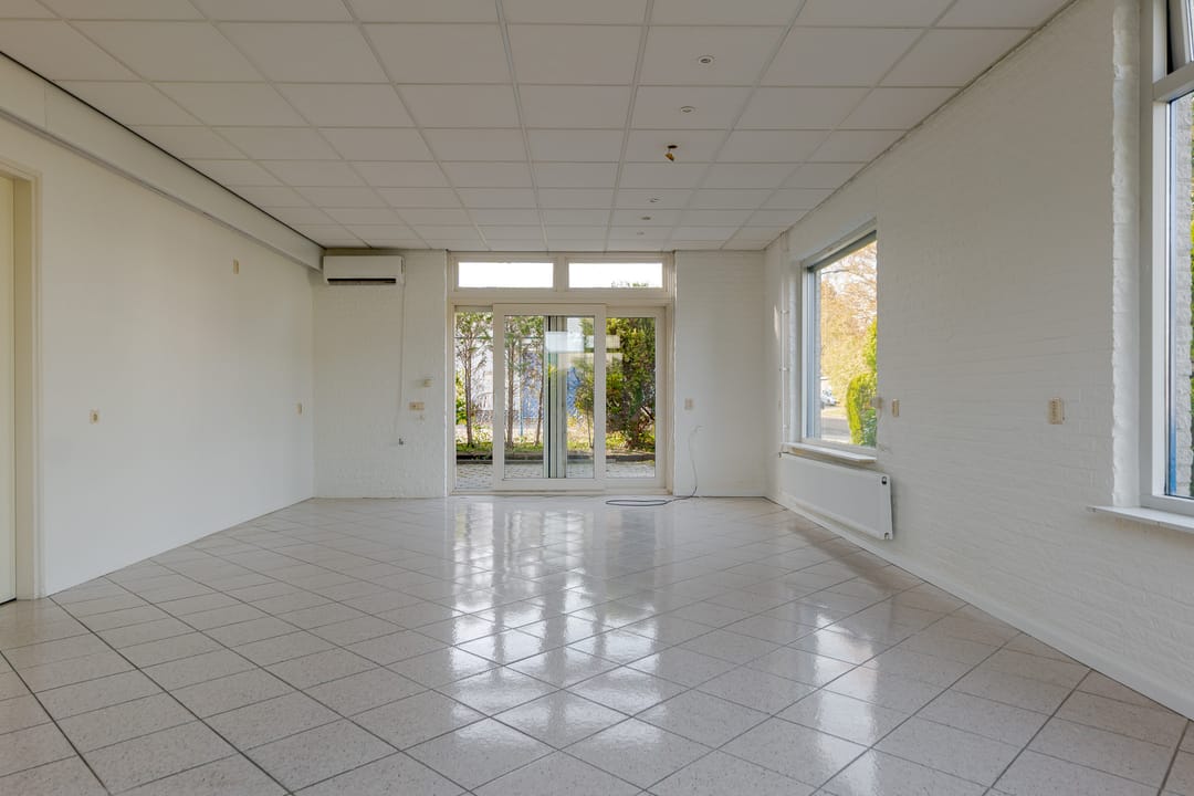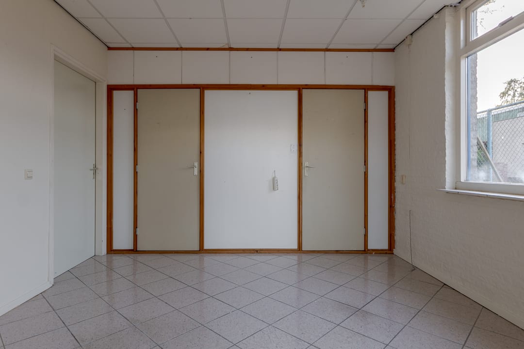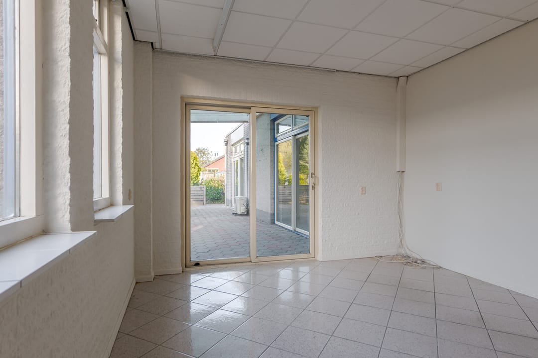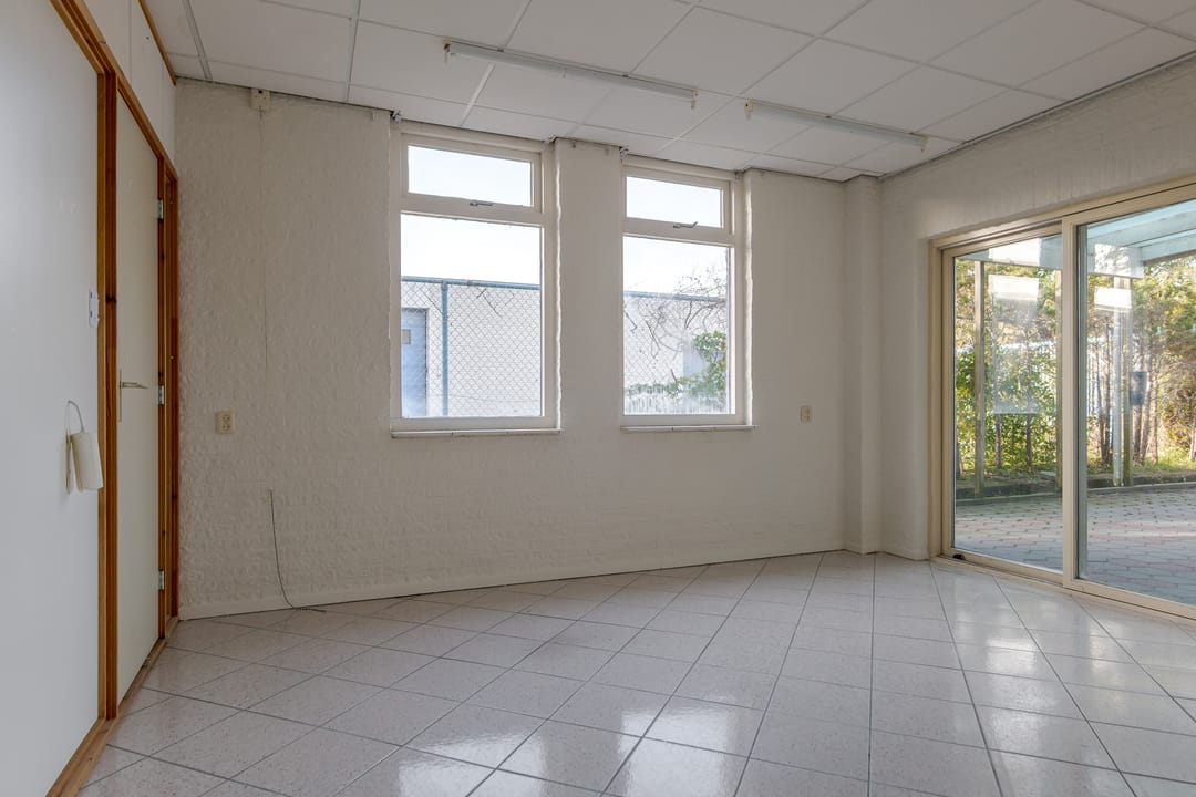 Vanuit de woning loop je binnendoor naar de bedrijfsloods van circa 126 m², voorzien van keukenblok, badkamer en gasheater. De loods heeft een vrije hoogte van bijna 5 meter en een segmentdeur van 4,20 meter hoog. Naast de loods bevindt zich een kantoorruimte met twee kamers, een keukenblok, toilet en badkamer – eventueel ook te gebruiken als extra woonruimte.
