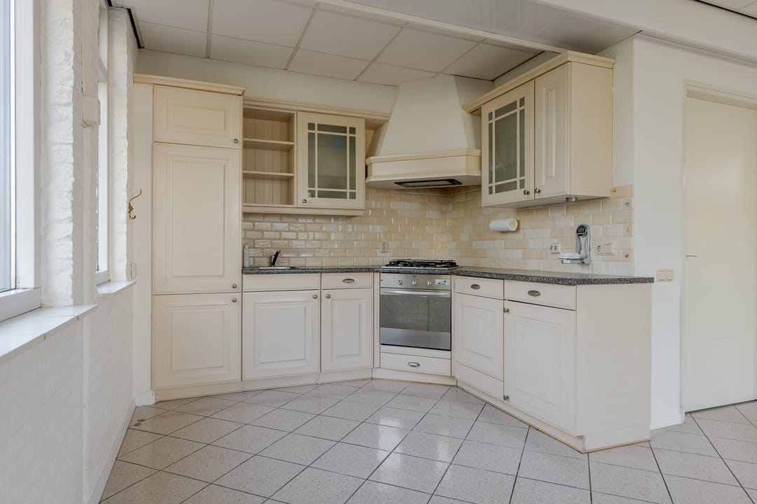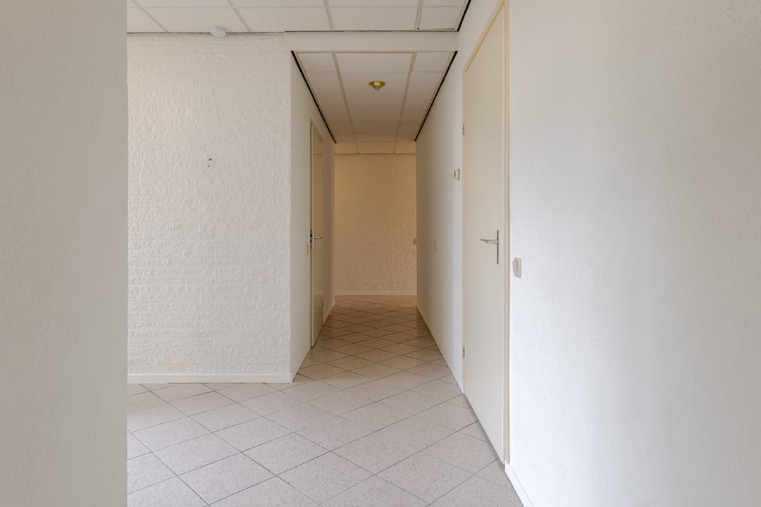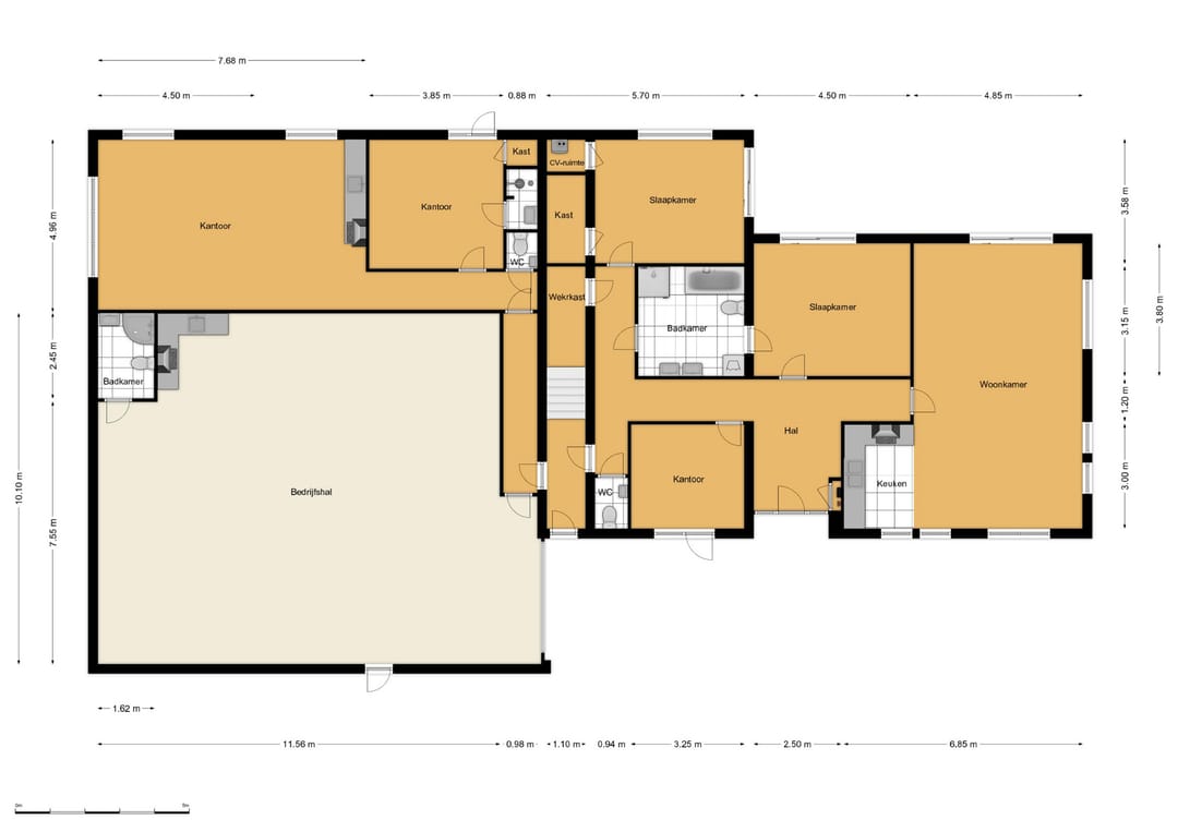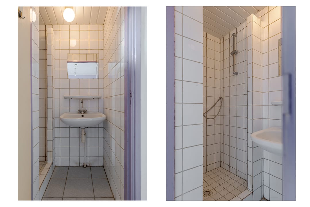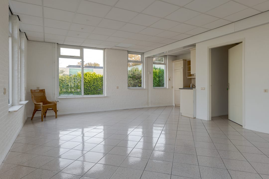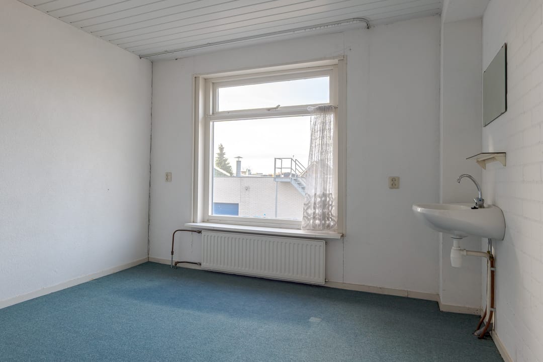 Vanuit de woning loop je binnendoor naar de bedrijfsloods van circa 126 m², voorzien van keukenblok, badkamer en gasheater. De loods heeft een vrije hoogte van bijna 5 meter en een segmentdeur van 4,20 meter hoog. Naast de loods bevindt zich een kantoorruimte met twee kamers, een keukenblok, toilet en badkamer – eventueel ook te gebruiken als extra woonruimte.
