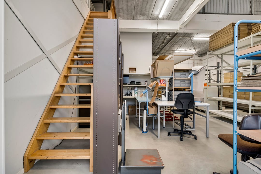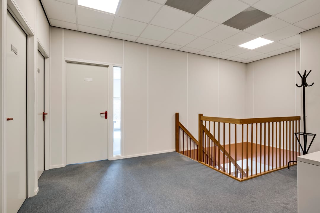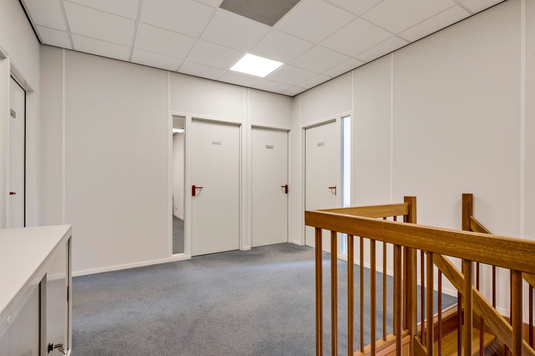 Overloop, drie kantoorkamers, waarvan twee kantoorkamers voorzien zijn van daglicht, sanitair op de overloop, opslag-/magazijn met vide en cv-ruimte