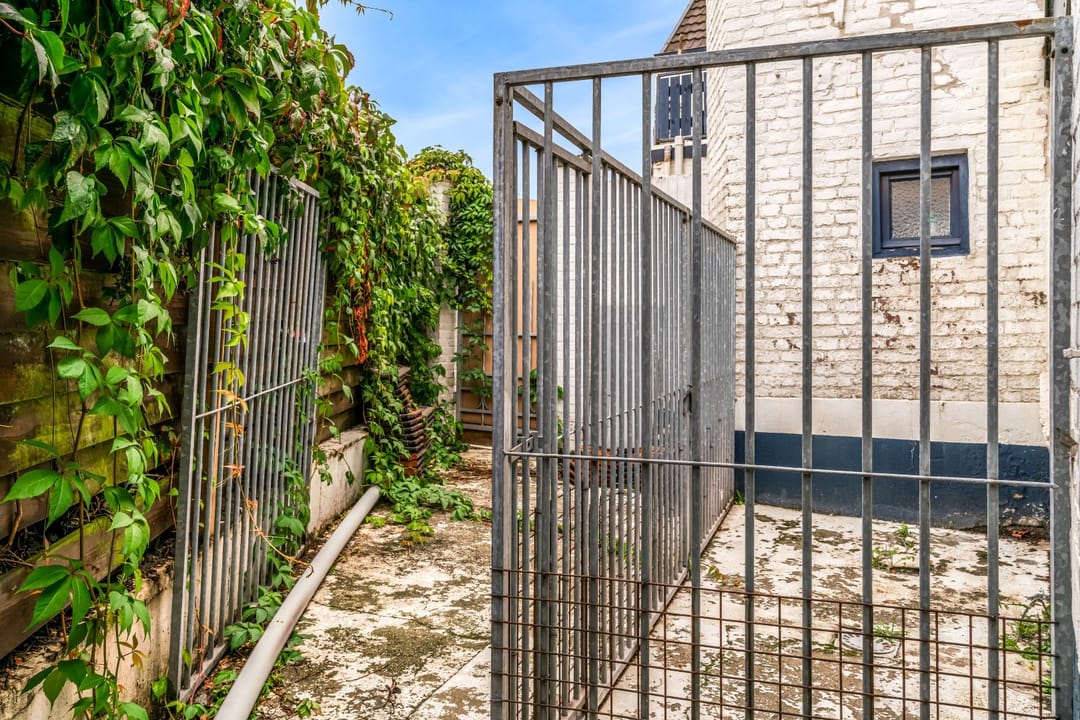 Aan de achterzijde bevindt zich een geheel betegelde tuin met een eigen achterom.
