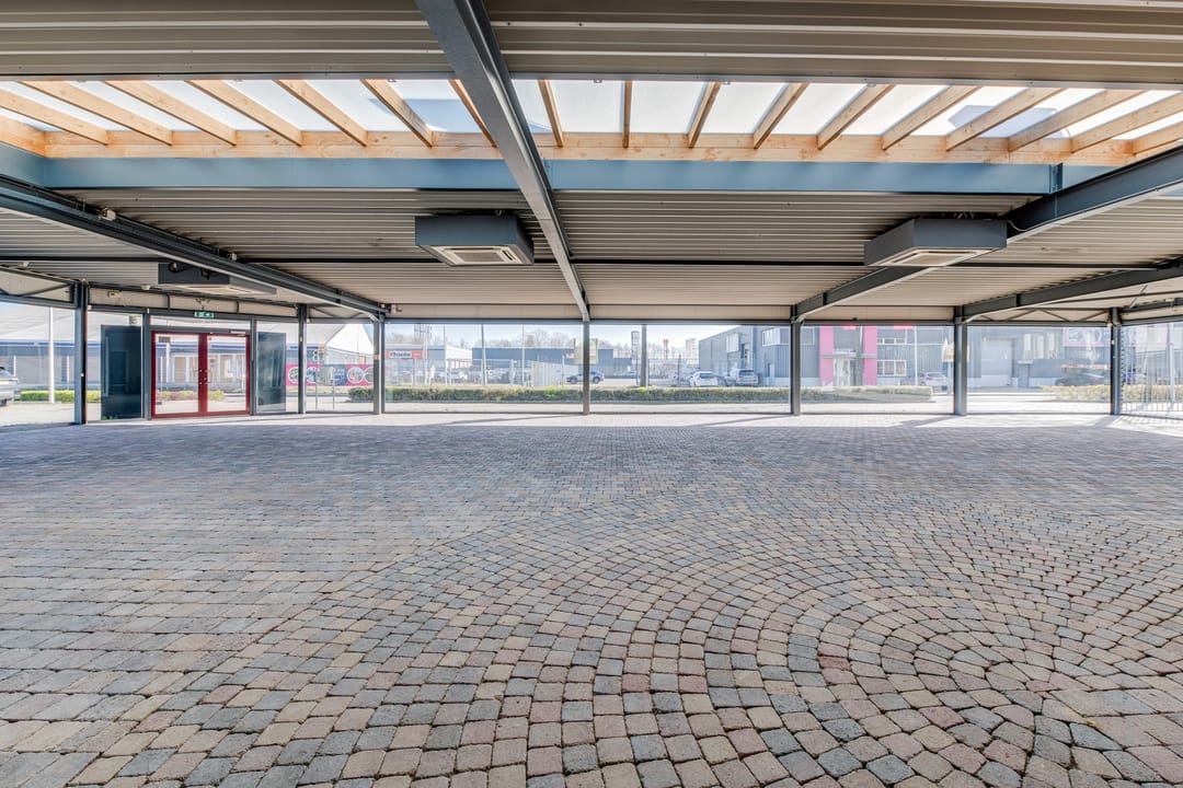 Op dit moment is deze royale bedrijfsruimte in gebruik door een bedrijf dat gespecialiseerd is in terrasoverkappingen. De huidige huurder heeft de ruimte tijdelijk ingericht als showroom, waarbij verschillende modellen overkappingen zijn opgesteld.