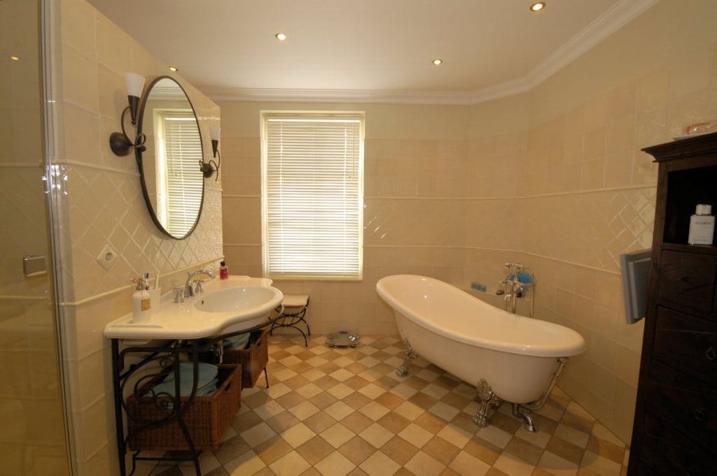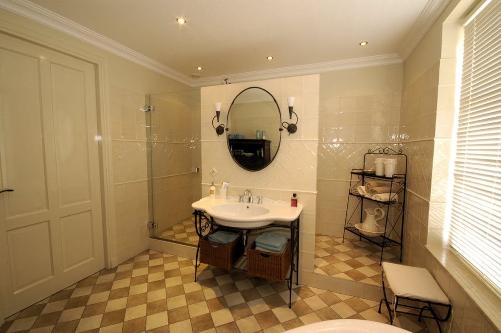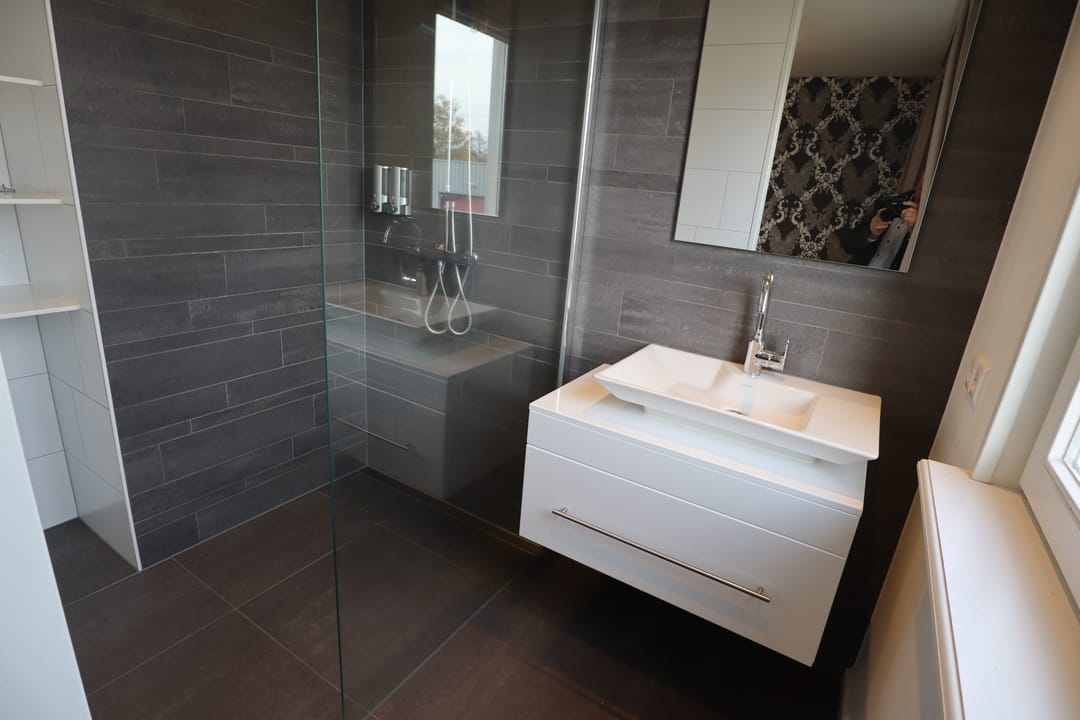 • Badkamer met inloopdouche en vast wastafelmeubel.