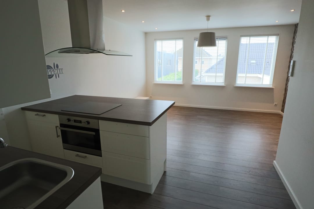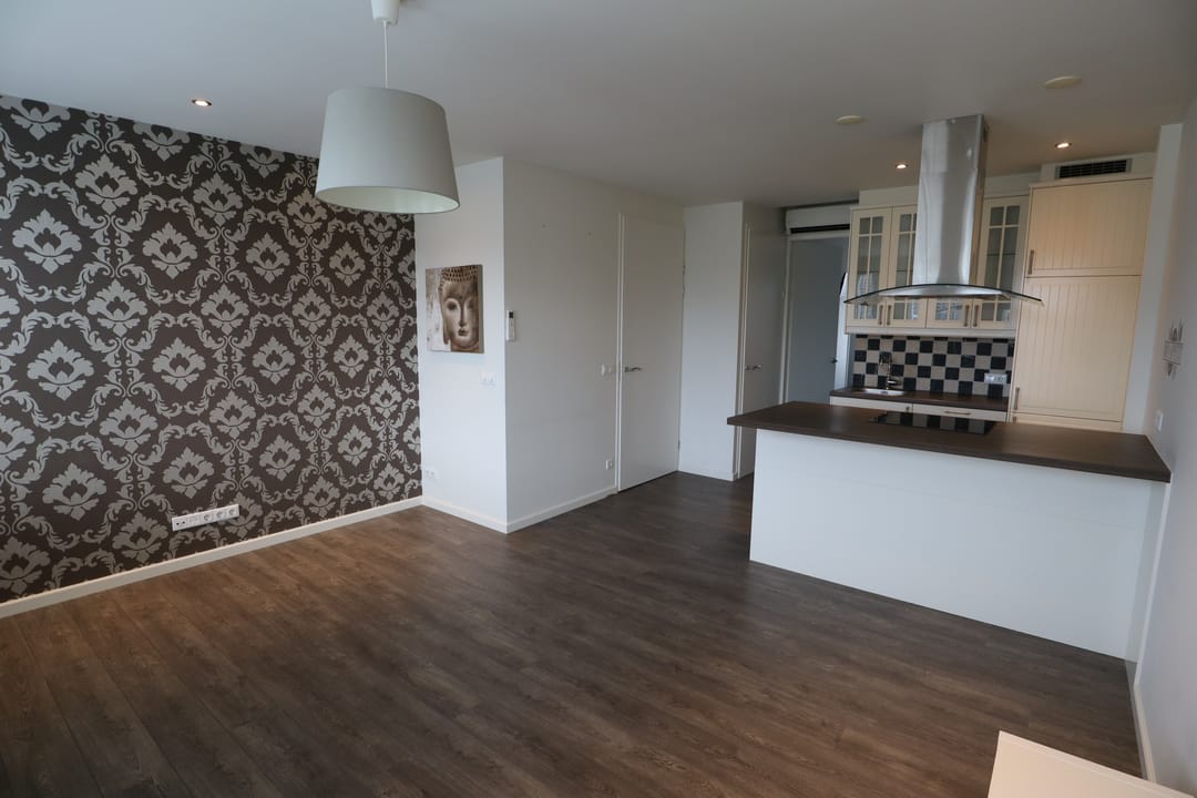 • Woonkamer met open keuken voorzien van koel/vriescombinatie, inductiekookplaat, combimagnetron, vaatwasser en afzuigkap.