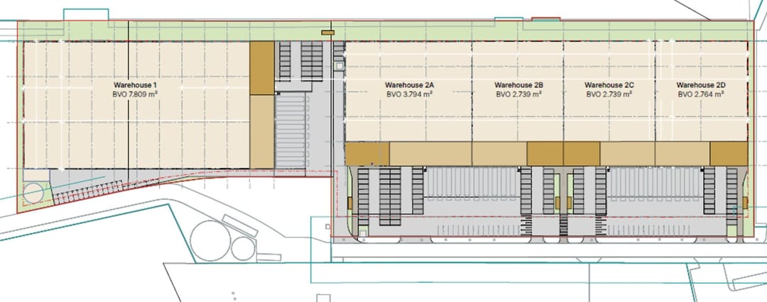 - Lichtstraten, loading docks, krachtstroom, sprinkler, toilet en pantry