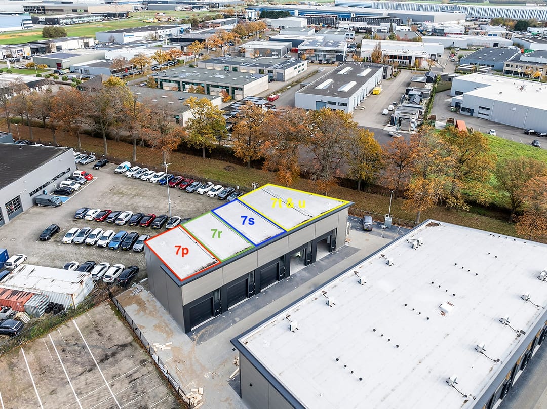 - 7r: circa 104,5 m2, onderverdeeld in circa 65,2 m2 bedrijfsruimte (bg) en circa 39,3 m2 entresolvloer;
