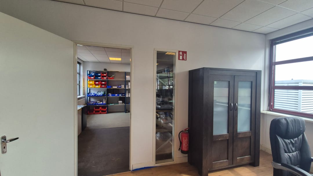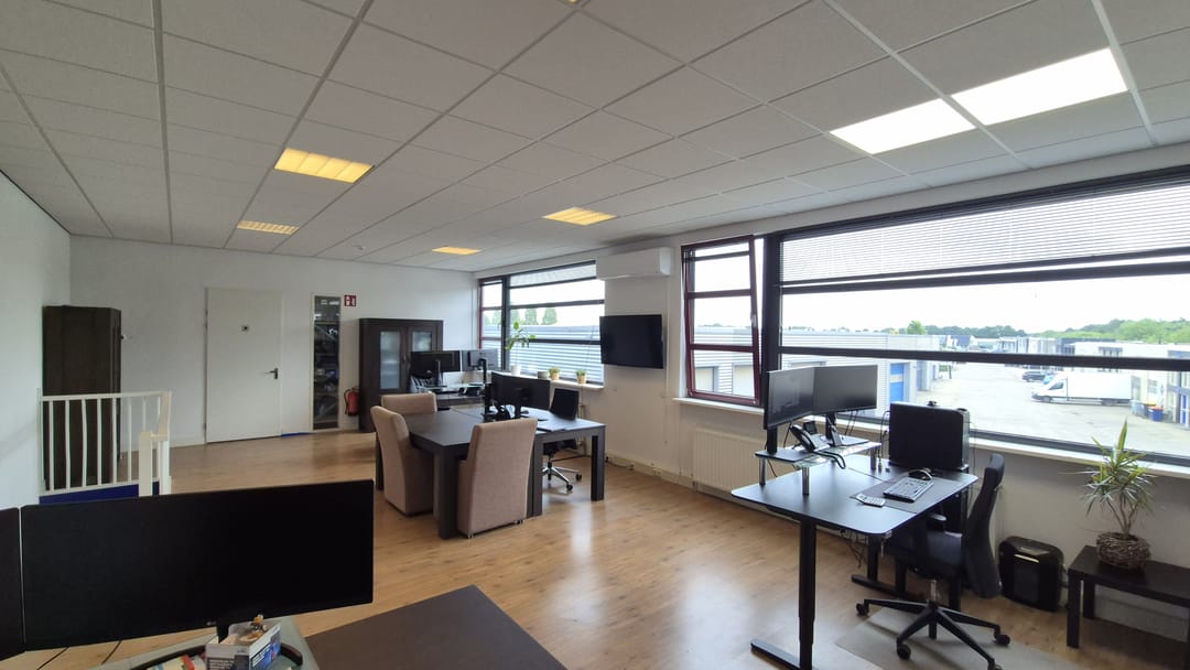 De begane grond is voorzien van twee overheaddeuren, waarvan één uitkomt op het achtergelegen terrein. De verdieping is via een vaste trap bereikbaar en is afgewerkt als nette kantoorruimte. Een deel is momenteel ingericht als magazijn, maar dit is eenvoudig om te bouwen tot extra kantoor- of showroomruimte. Tevens is op de verdieping een pantry aanwezig.