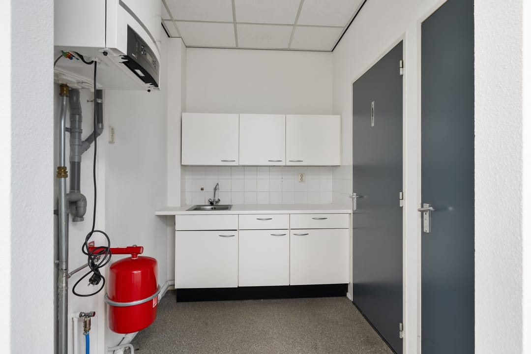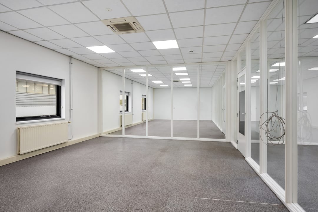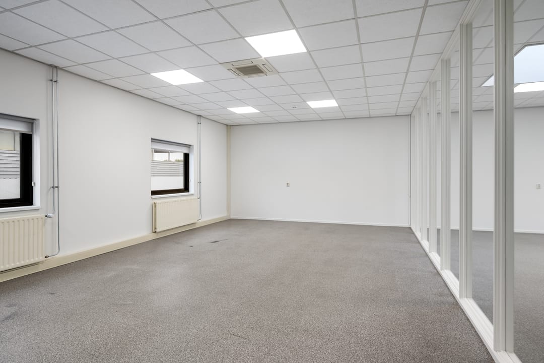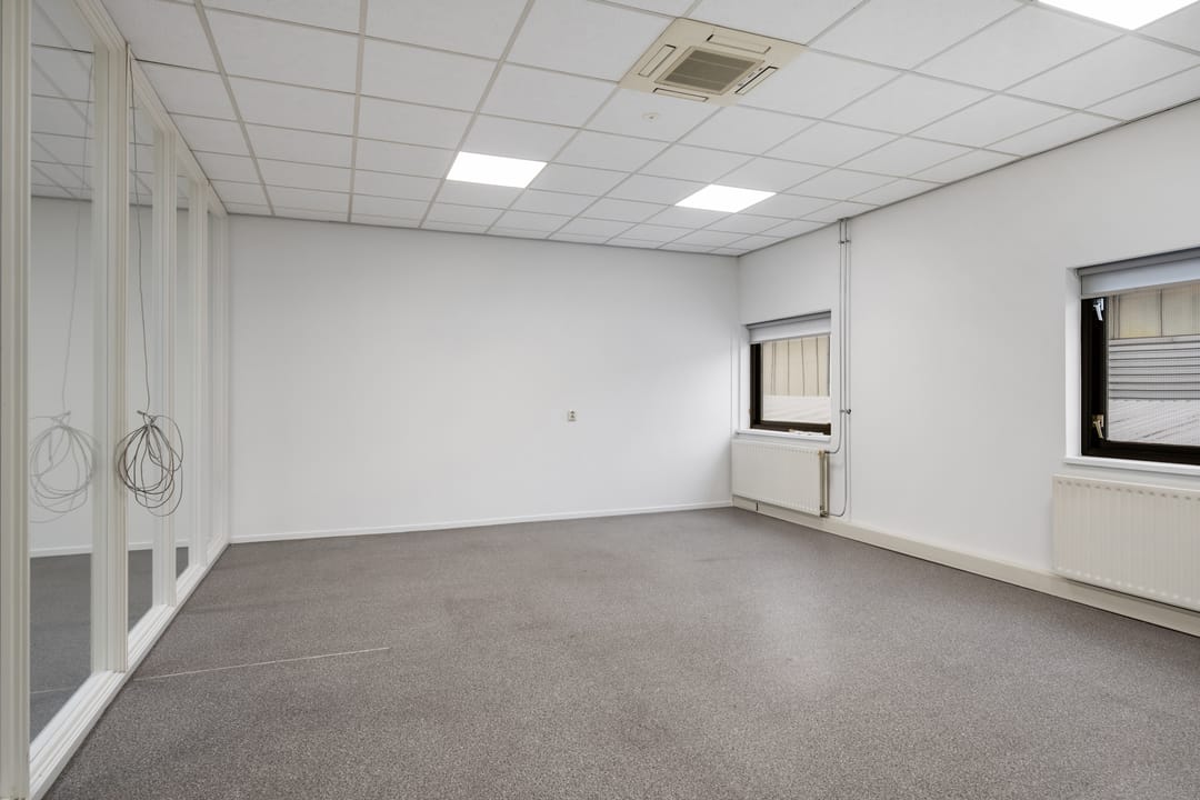 De kantoorruimte beschikt over ruim voldoende raampartijen in zowel de voor- en achtergevel, glazen scheidingswanden, een keurige betegelde toiletgroep (M/V), wandcontactdozen en plaatradiatoren aangesloten op de cv-installatie.
