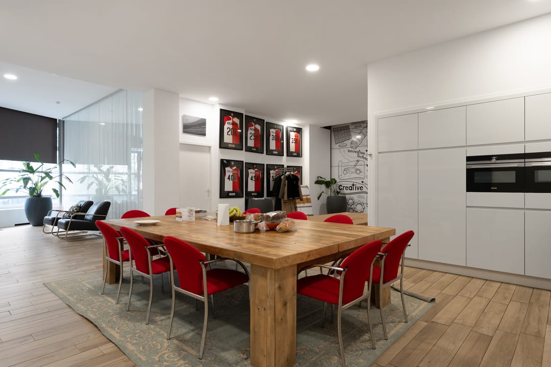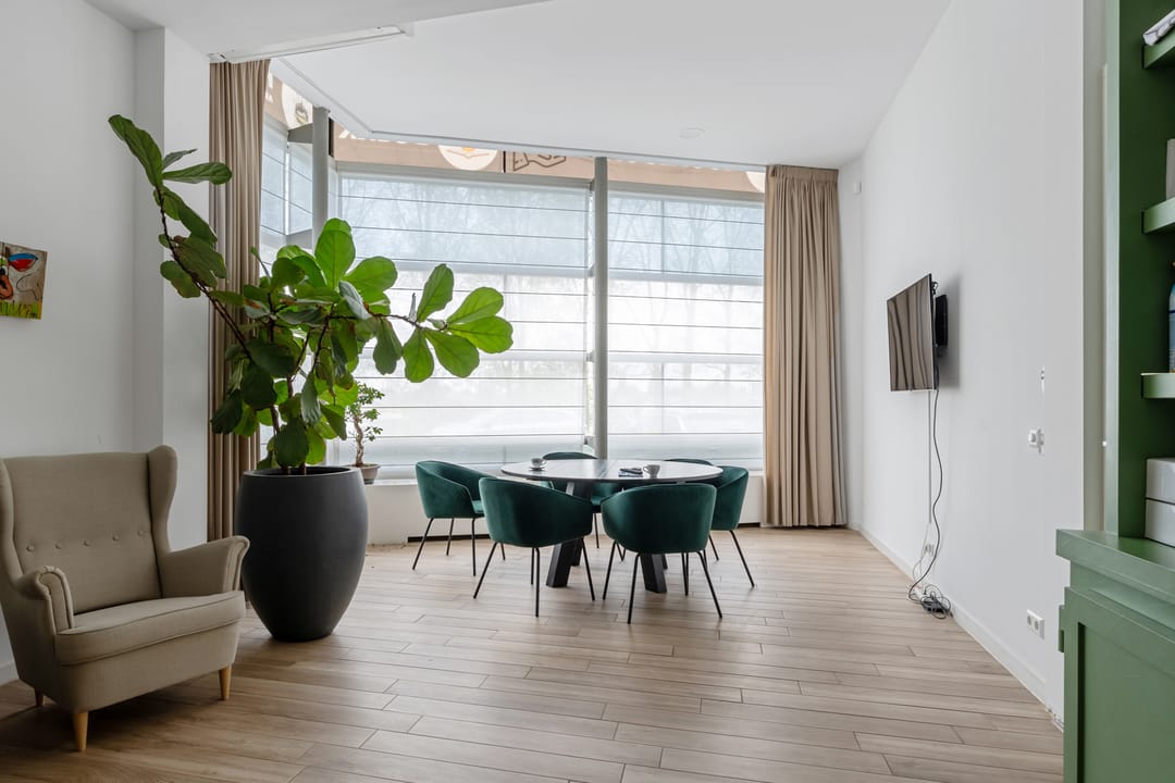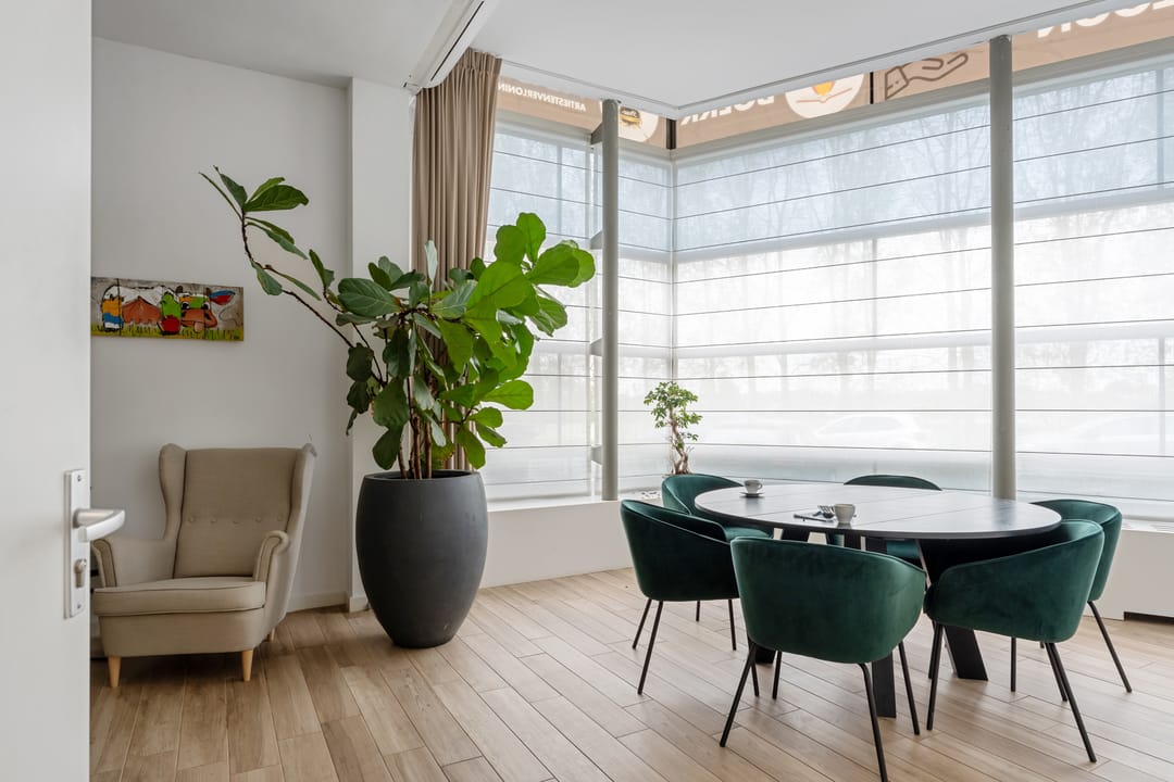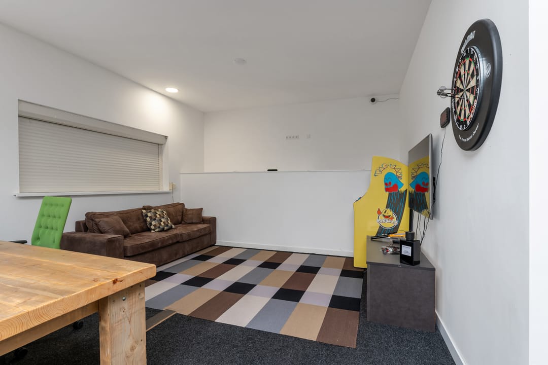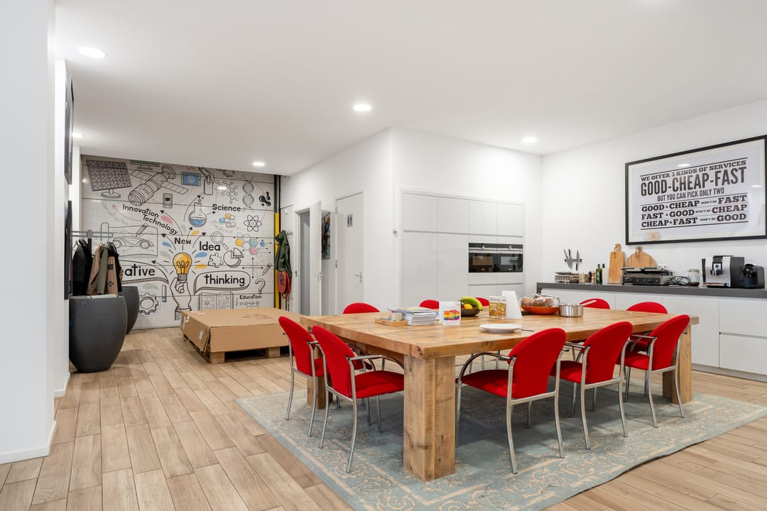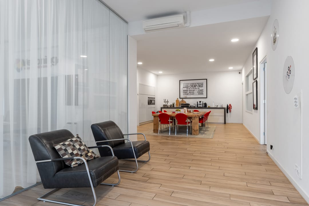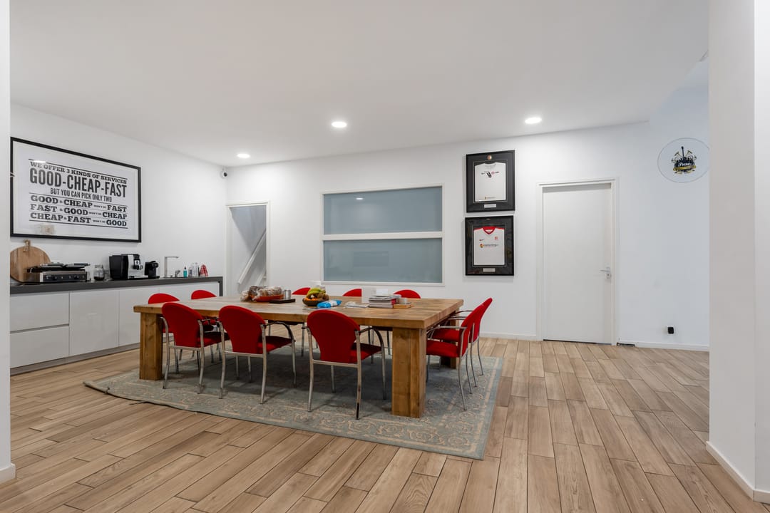 Verder bevinden zich op de begane grond een moderne toiletruimte met hangend toilet en fontein, een voorraad-/serverruimte en een kantoor-/vergaderruimte. De afwerking is van hoog niveau met een luxe keramiekvloer, strak gestuukte wanden en plafonds, ingebouwde LED-verlichting, airconditioning en stijlvolle glazen scheidingswanden. Daarnaast is de ruimte voorzien van een elektrisch bedienbare overheaddeur met aparte loopdeur in de zijgevel. De luxe uitgevoerde keuken is voorzien van hoogwaardige inbouwapparatuur, waaronder een Siemens vaatwasser, twee combiovens, koelkast, Bora kookplaat met geïntegreerde afzuiging, Quooker en een royaal werkblad.