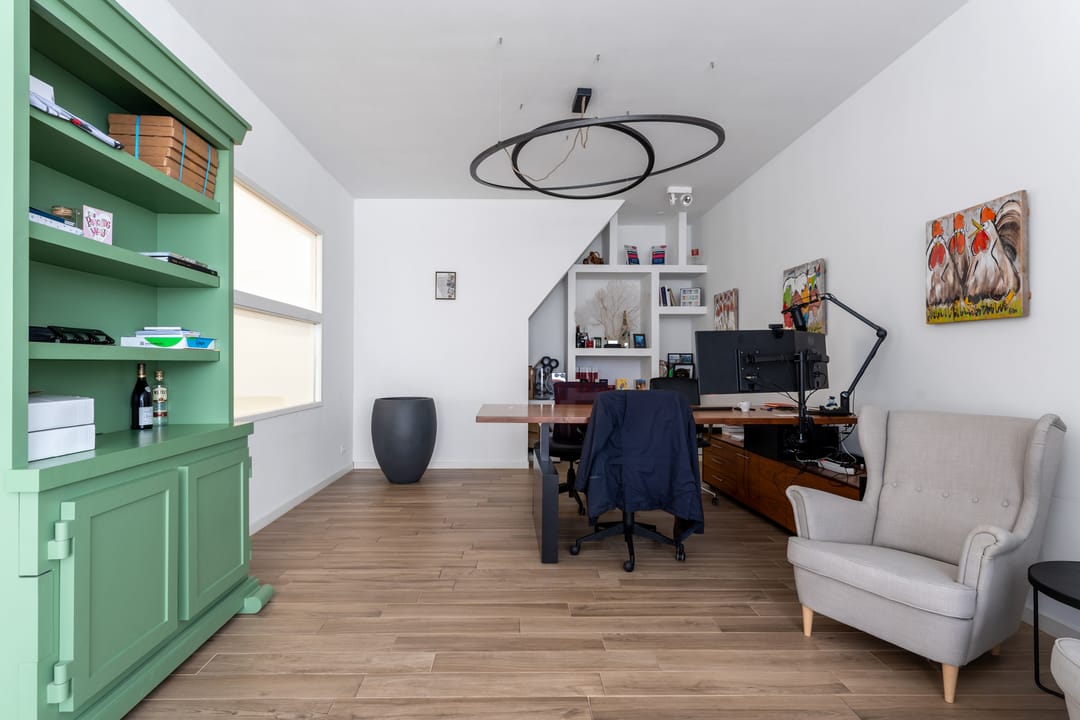 De begane grond beschikt over een zelfstandige dubbele entree, ruime hal met keuken, kantoor-/showroomruimte en een trapopgang naar de eerste verdieping. De showroom-/kantoorruimte heeft een hoogwaardige uitstraling en is zowel aan de voor- als zijgevel volledig voorzien van glas met dubbele beglazing en zonwering, wat zorgt voor veel daglicht en een fraai uitzicht op de aangrenzende watergang en omliggend groen.