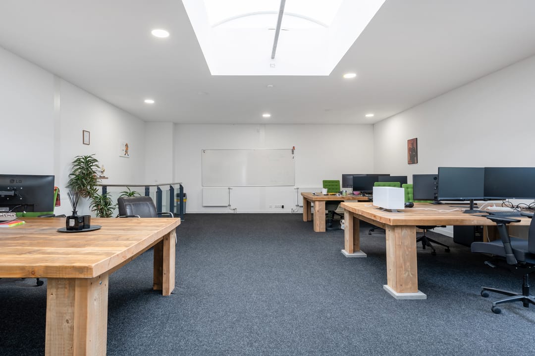 De eerste verdieping bestaat uit een royale open kantoorruimte met tapijtvloer, strak afgewerkte wanden en plafonds met inbouwspeakers, airconditioning, een lichtstraat en deels te openen ramen voorzien van dubbele beglazing en interne rolluiken. Ook op deze verdieping bevindt zich een moderne betegelde toiletruimte met hangend toilet en fontein.