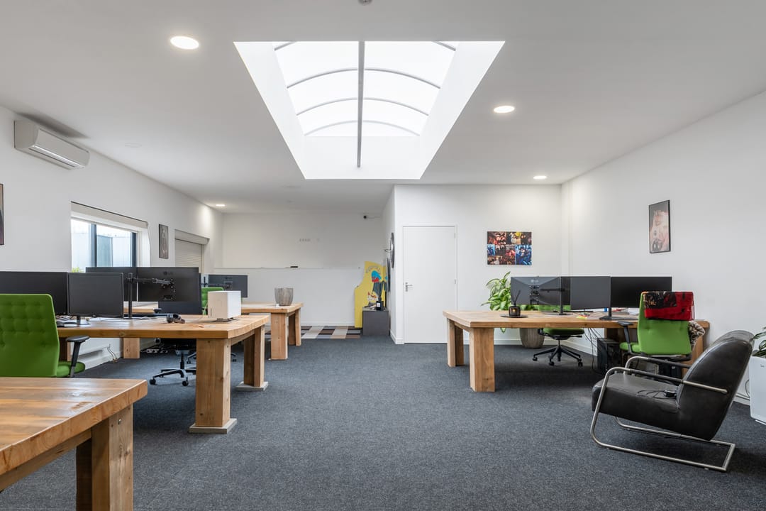 - Airconditioning, lichtstraten, overheaddeuren, krachtstroom, betonvloer, toilet, pantry, inbouwarmaturen en te openen ramen