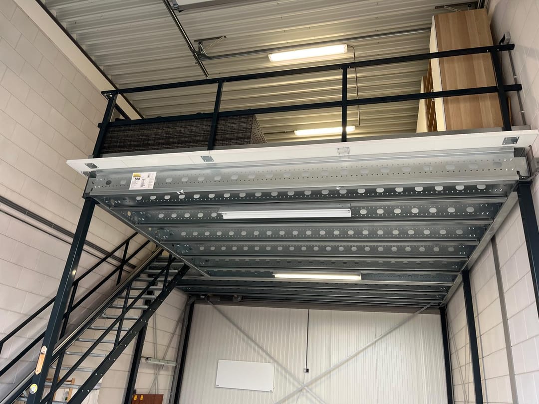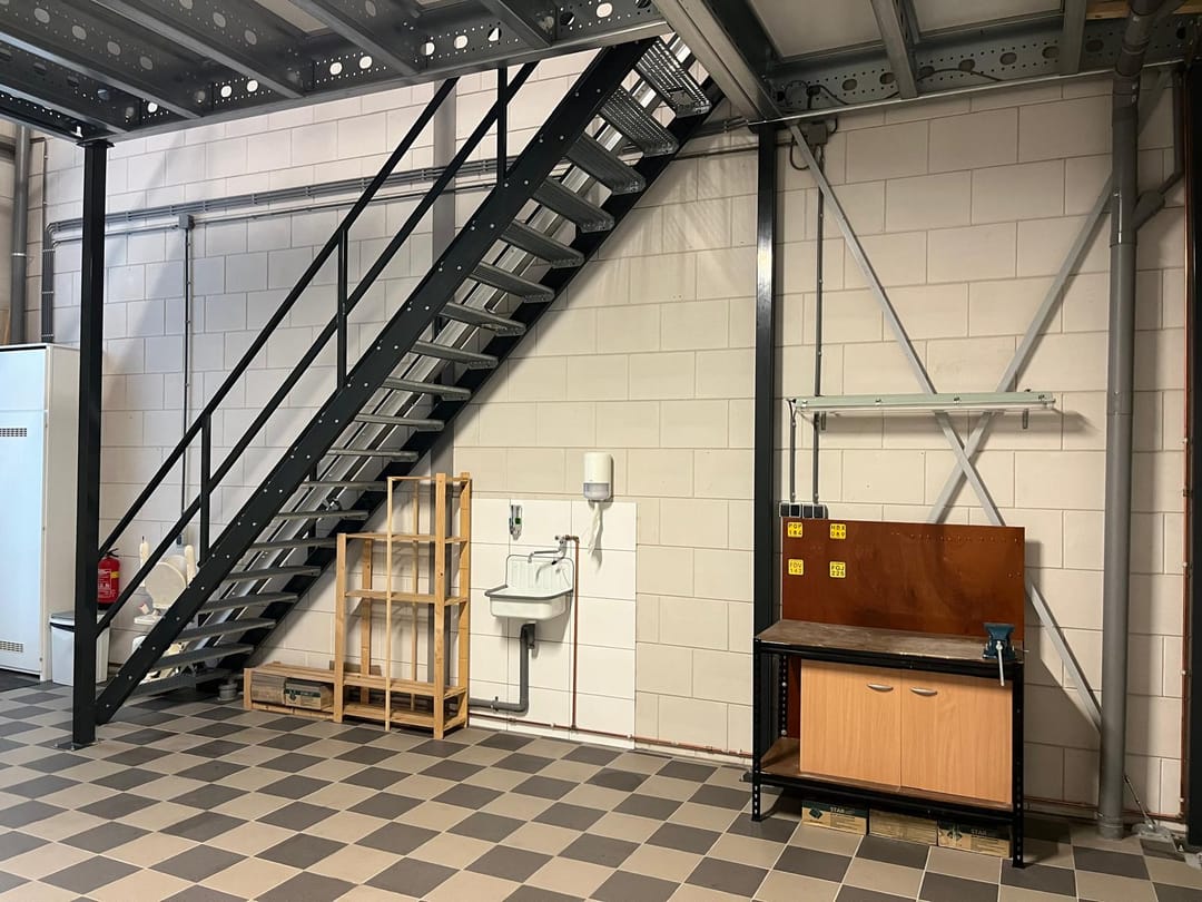 De verdieping is bereikbaar via een stalen trap en heeft een draagvermogen van circa 350 kg per m². Deze etage is efficiënt ingericht en voorzien van een complete keuken, warmwaterboiler, kastenwand en een volledig betegelde toiletruimte met vrijhangend closet. De vloer is afgewerkt met laminaat en het plafond is uitgerust met een warmteplaat.