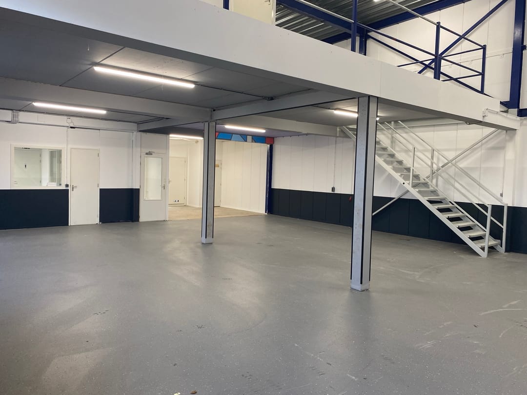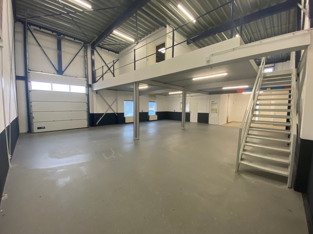 - Overheaddeuren, betonvloer, toilet, pantry, inbouwarmaturen en te openen ramen