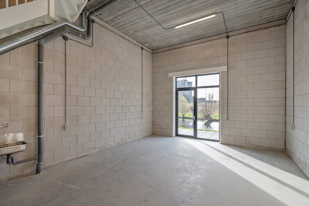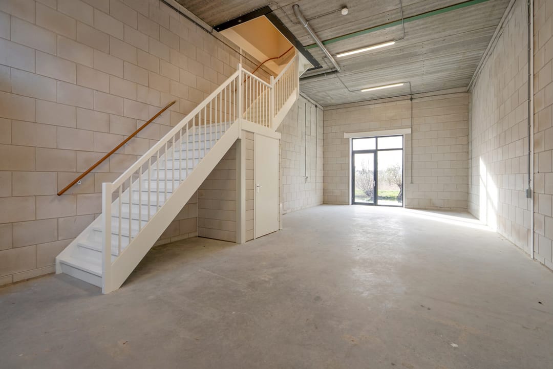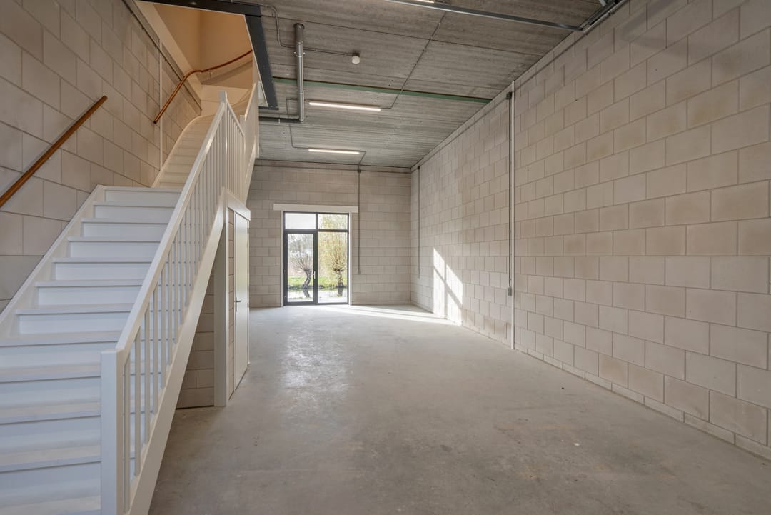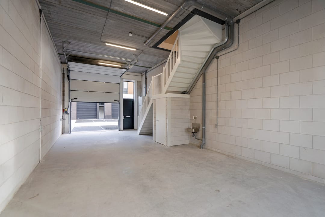 - Overheaddeuren, krachtstroom, betonvloer, toilet, pantry, airconditioning en te openen ramen