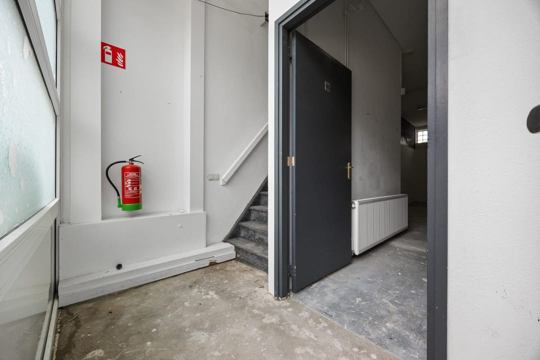 Voordeur voorzien van een rolluik en daarachter de entree met opgang naar de eerste verdieping en toegang naar de bedrijfshal. Direct aan de rechterhand de overhead deur die uitkomt op het voorgelegen gedeelde terrein van ca. 600m2. Aan de linkerhand, onder de trap, de wc.