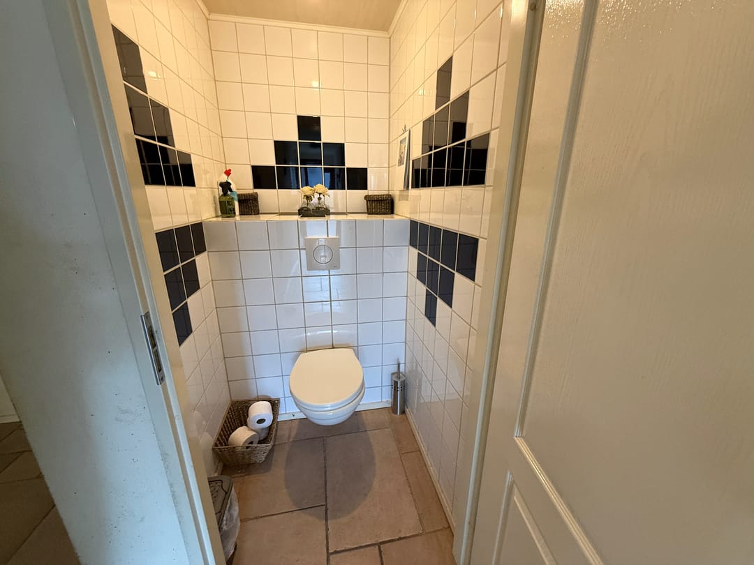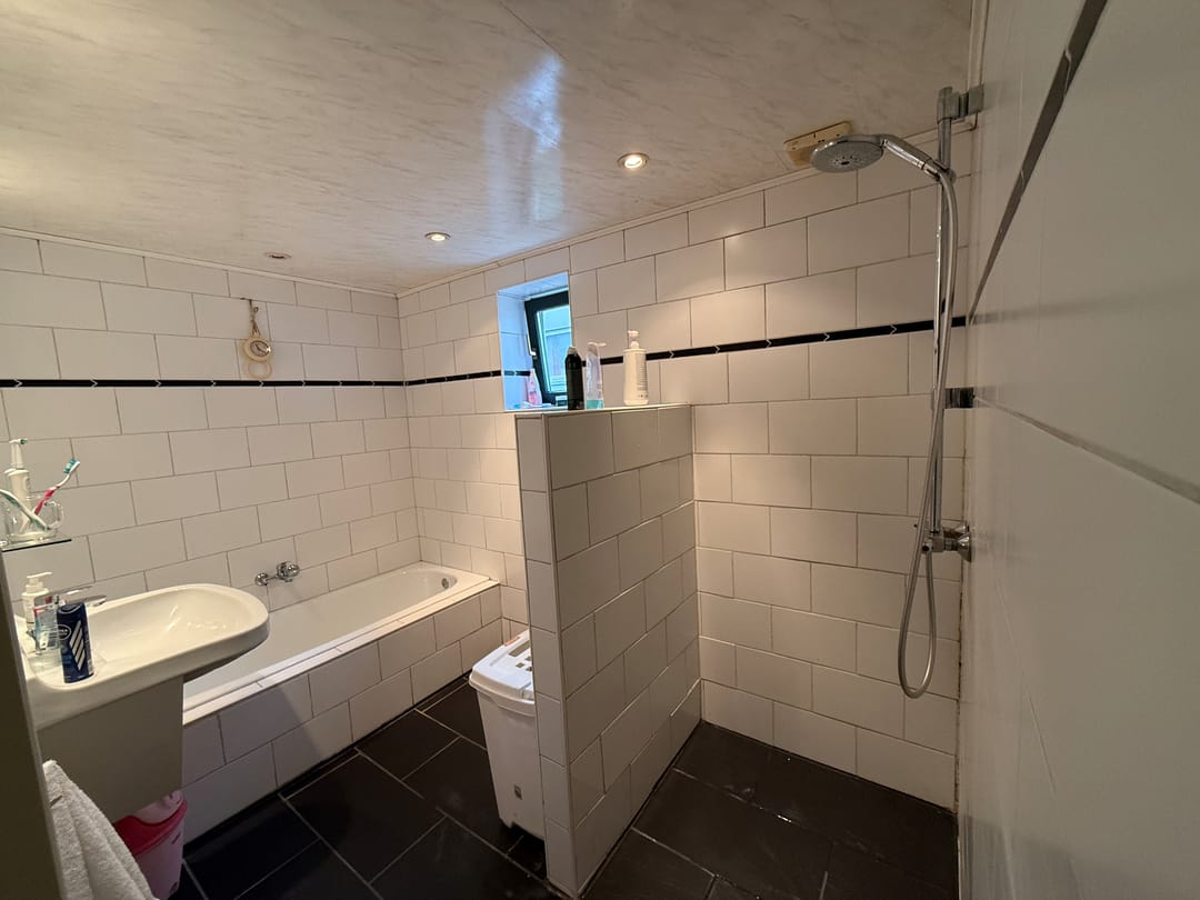 De badkamer op de begane grond is voorzien van een bad en douchehoek alsmede een wastafel.