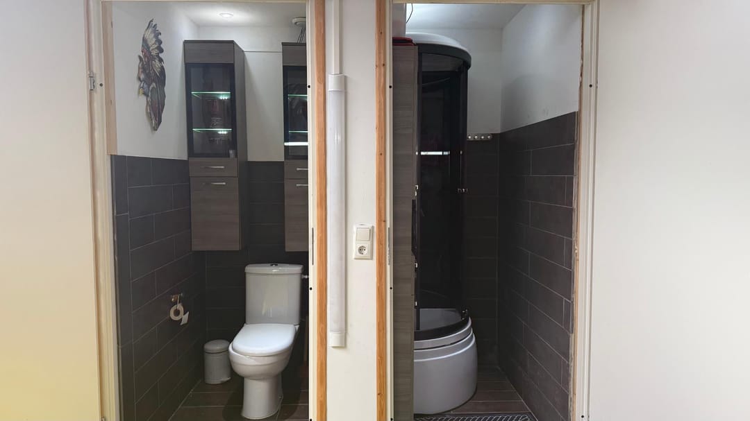 Op de begane grond is een toiletruimte en separate doucheruimte gevestigd, het plafond is afgewerkt met lichtspots.