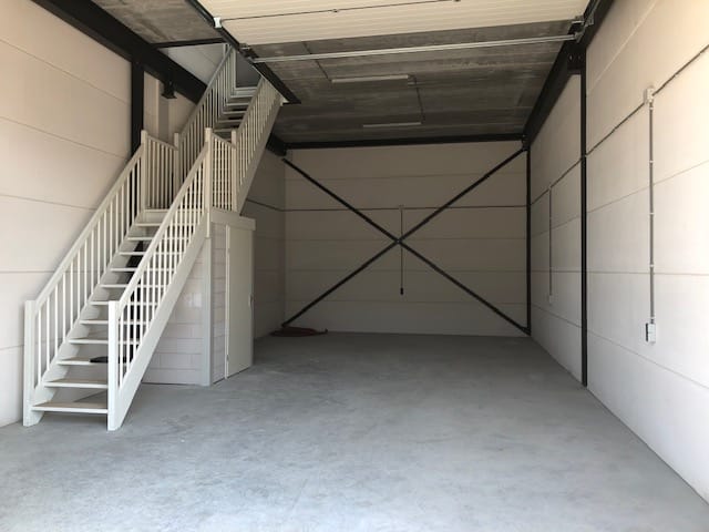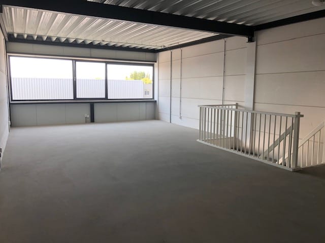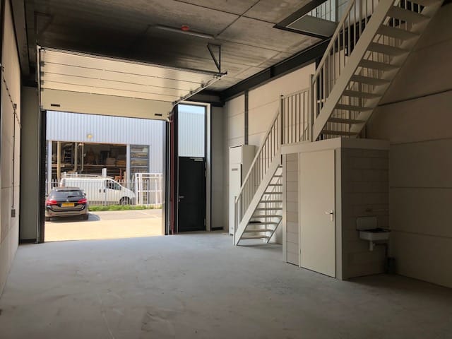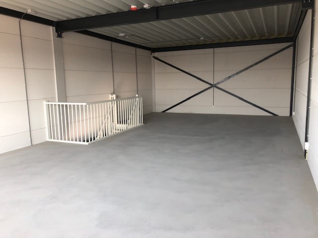- Overheaddeuren, betonvloer, toilet en te openen ramen