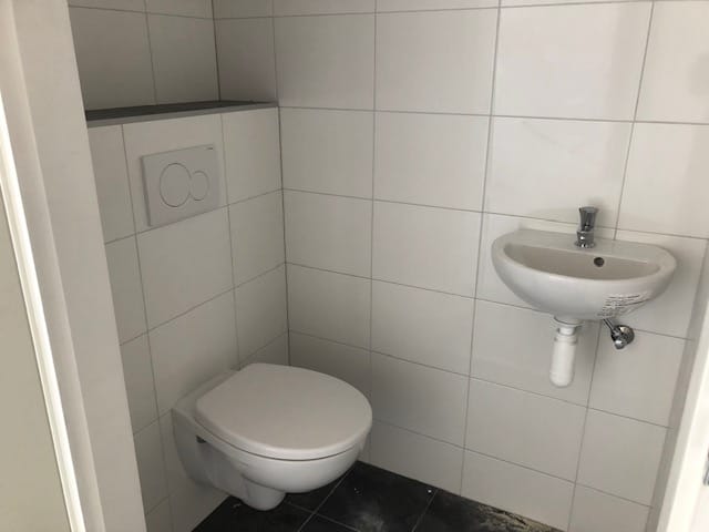 - Betegelde toiletruimte met hangend toilet en fontein;