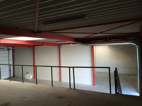 Achtergelegen bedrijfsruimte met twee elektrische inrij poorten (4 x 4 mtr / voor en achter), glad afgewerkte betonvloeren, vloeistofdicht, lichtstraat, krachtstroom, alsmede een entresol voor extra opslag.
