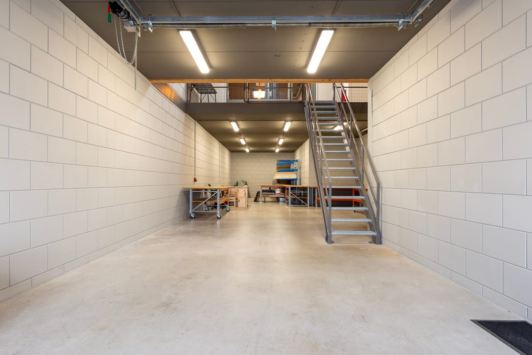 De bedrijfsruimte (circa 114,1 vierkante meter) op de begane grond is bereikbaar via de entree, maar ook via de elektrische overheaddeur.