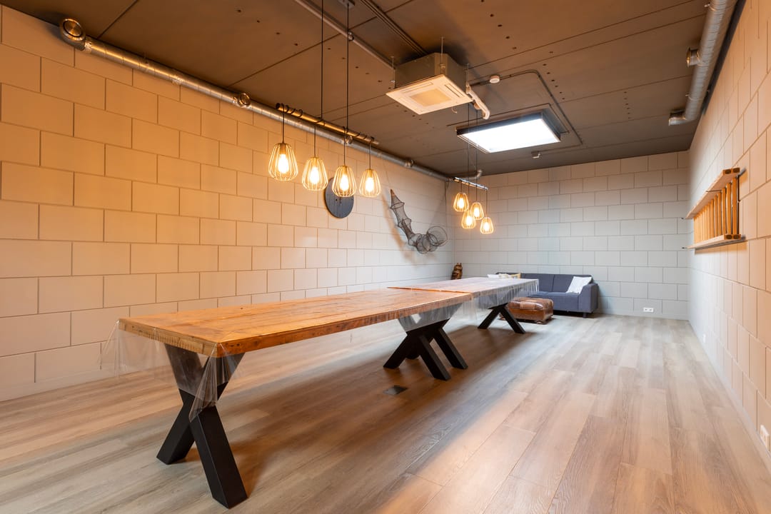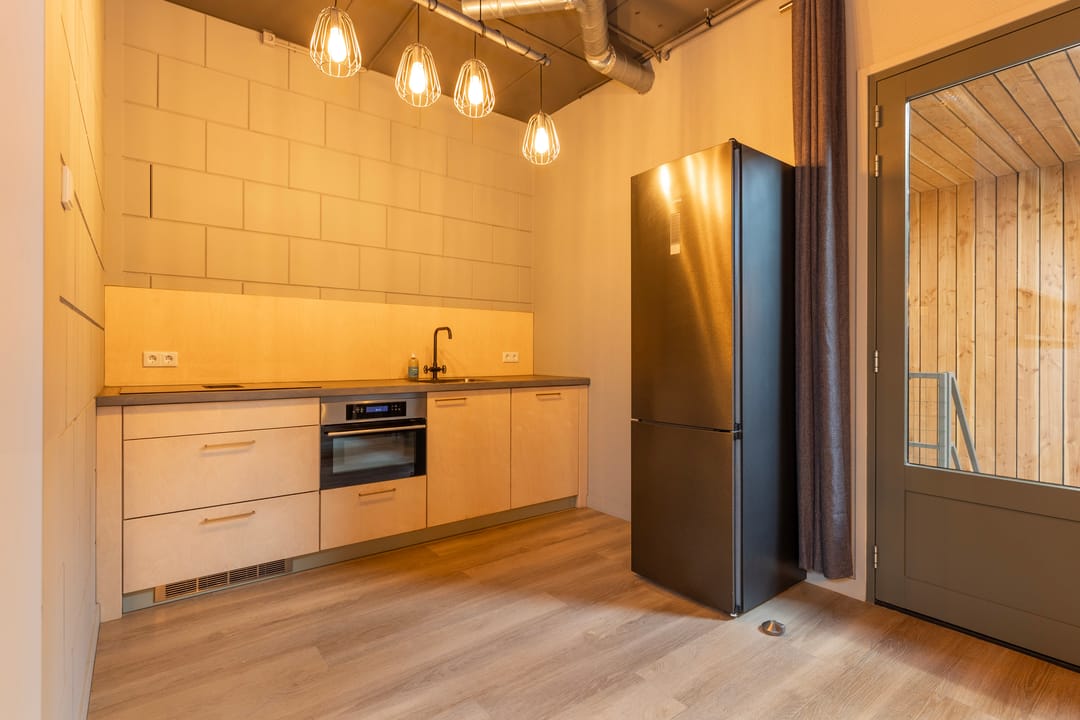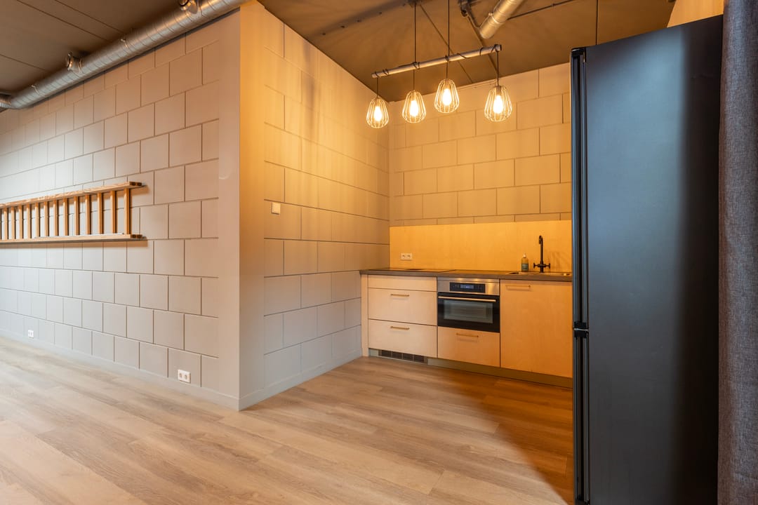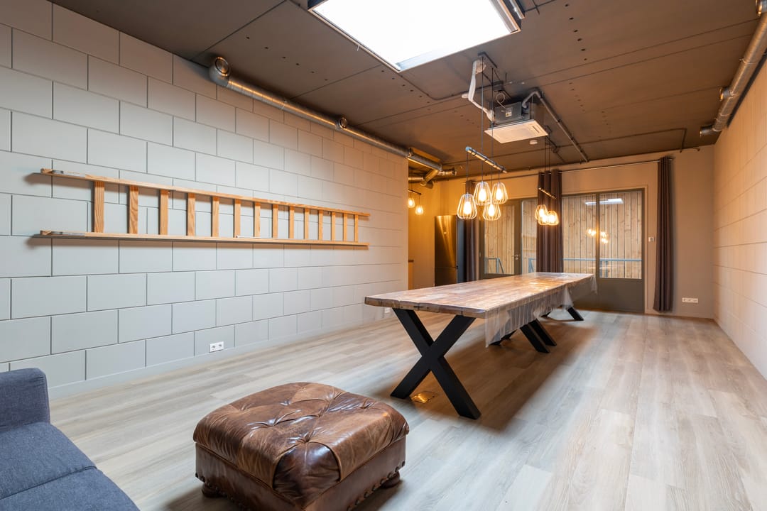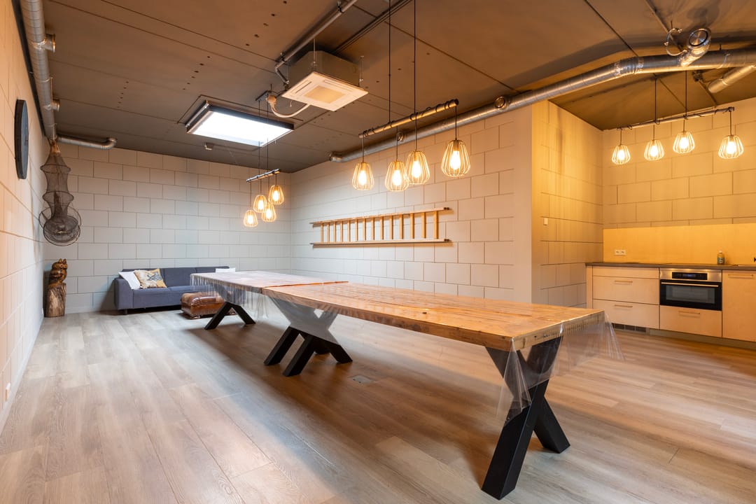 Via de trap in de bedrijfsruimte is de overloop met toegang naar de woonkamer/ontmoetingsruimte (circa 47,7 vierkante meter) bereikbaar. Deze ruimte beschikt over een pantry met een spoelbak, een inductiekookplaat met afzuiging, een oven, een vaatwasser en een losse koel- en vriescombinatie.