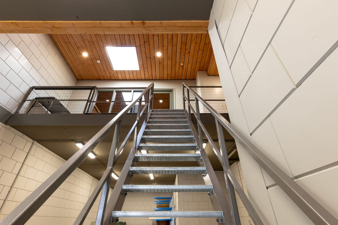Op de verdieping zijn drie kantoorruimtes gesitueerd. Eén van deze ruimtes is ingericht als zijnde woonkamer/ontmoetingsruimte. Daarnaast is hier een douchevoorziening en een toiletruimte aanwezig.