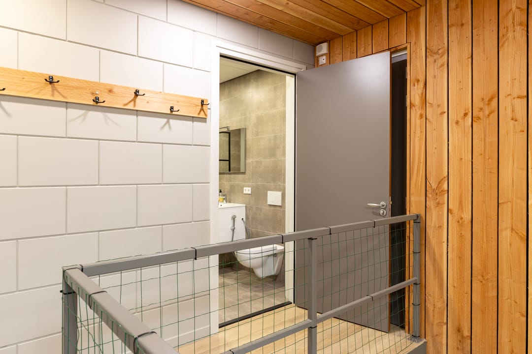 Via de overloop is de douchevoorziening met toilet en wasmachine-aansluiting bereikbaar.