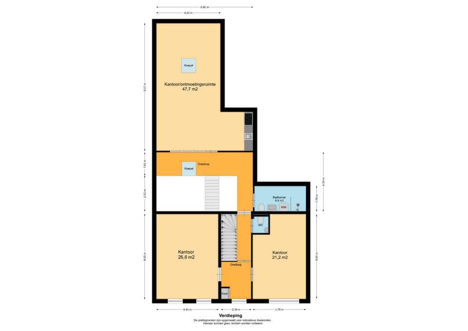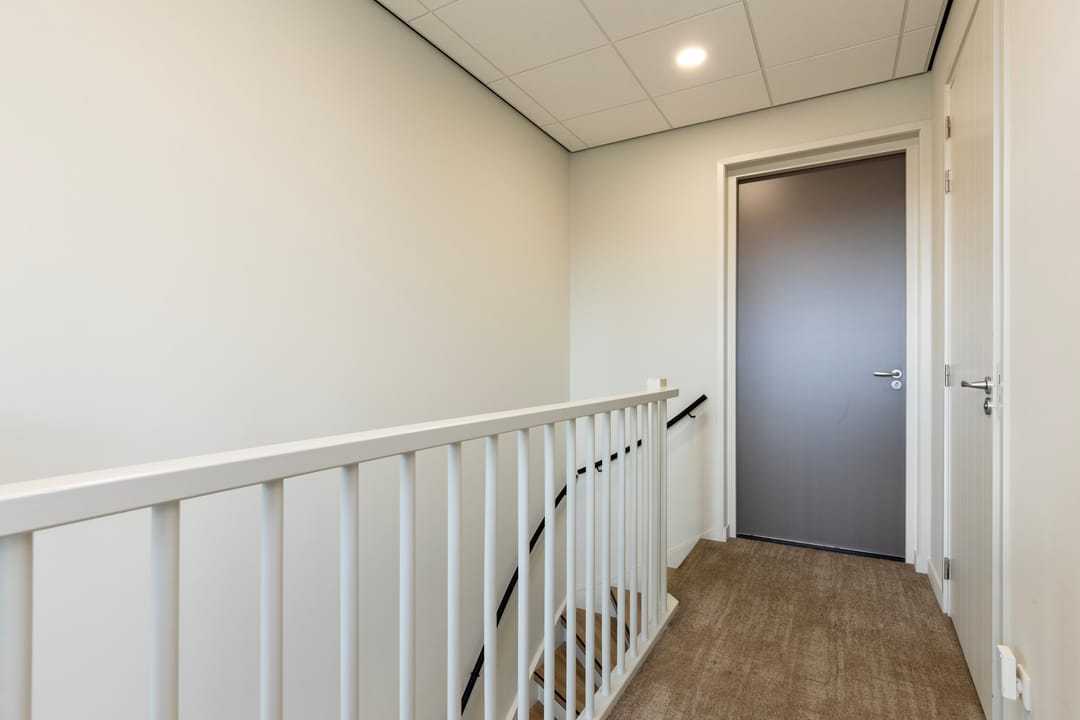 De kantoorruimtes op de verdieping (circa 26,6 en 21,2 vierkante meter) zijn via de overloop, maar ook via de trap in de entree bereikbaar.
