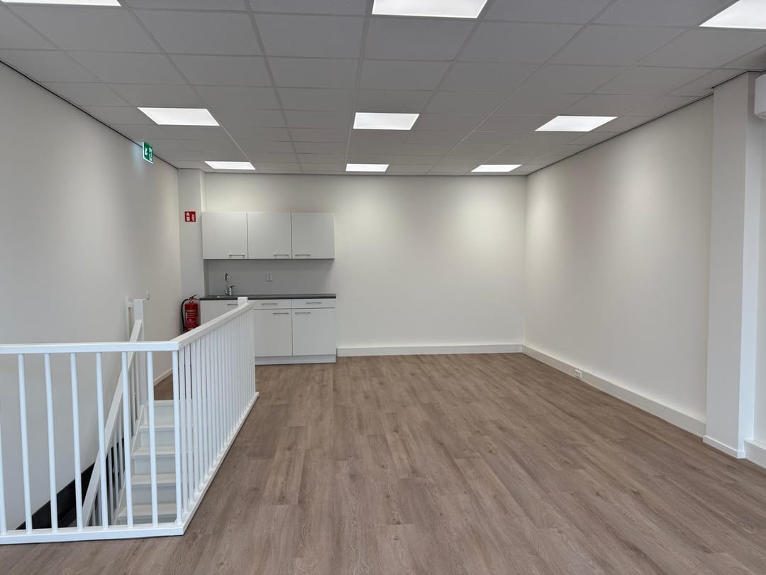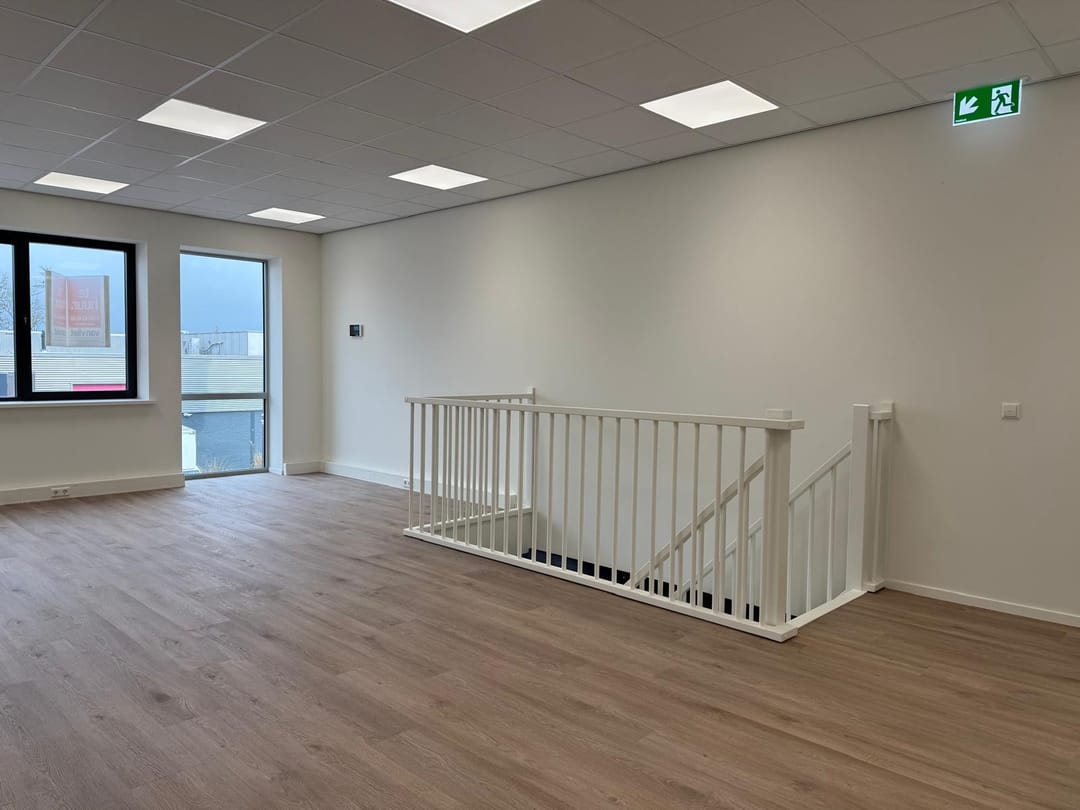 De kantoorruimte op de verdieping is o.a. voorzien van pvc-vloerafwerking, voorzetwanden afgewerkt met gesausd glasweefsel, een wandgoot met elektra- en data-aansluitingen, een systeemplafond met ledverlichting, veel daglicht dankzij de raampartij in de voorgevel, verwarming en koeling door middel van een airco-splitunit, een pantry met onder- en bovenkastjes en een bel-/intercominstallatie.