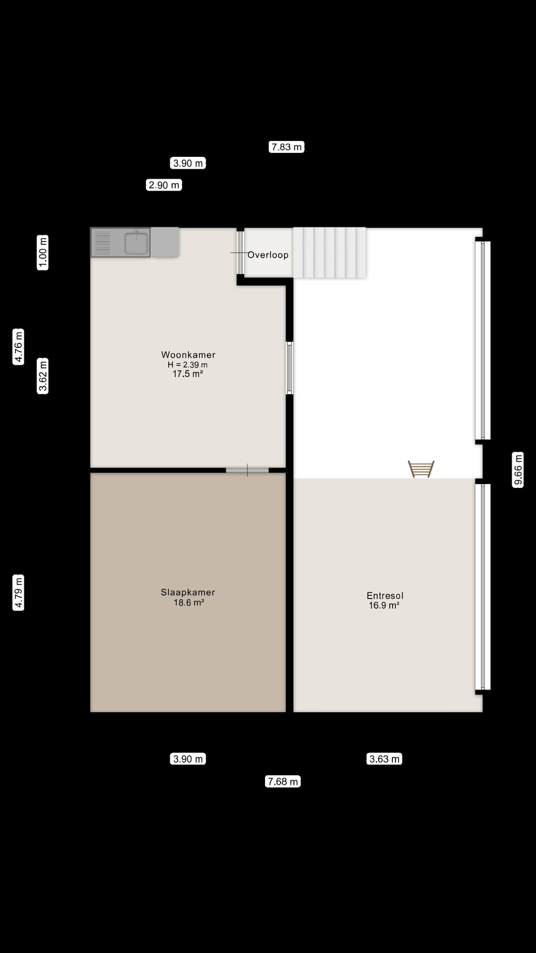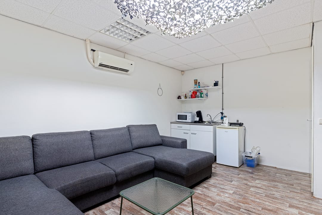 Overloop met toegang tot kantoorruimte voorzien van pantry. Daarnaast een bergruimte. Vanuit de bedrijfsruimte is de entresolvloer bereikbaar.