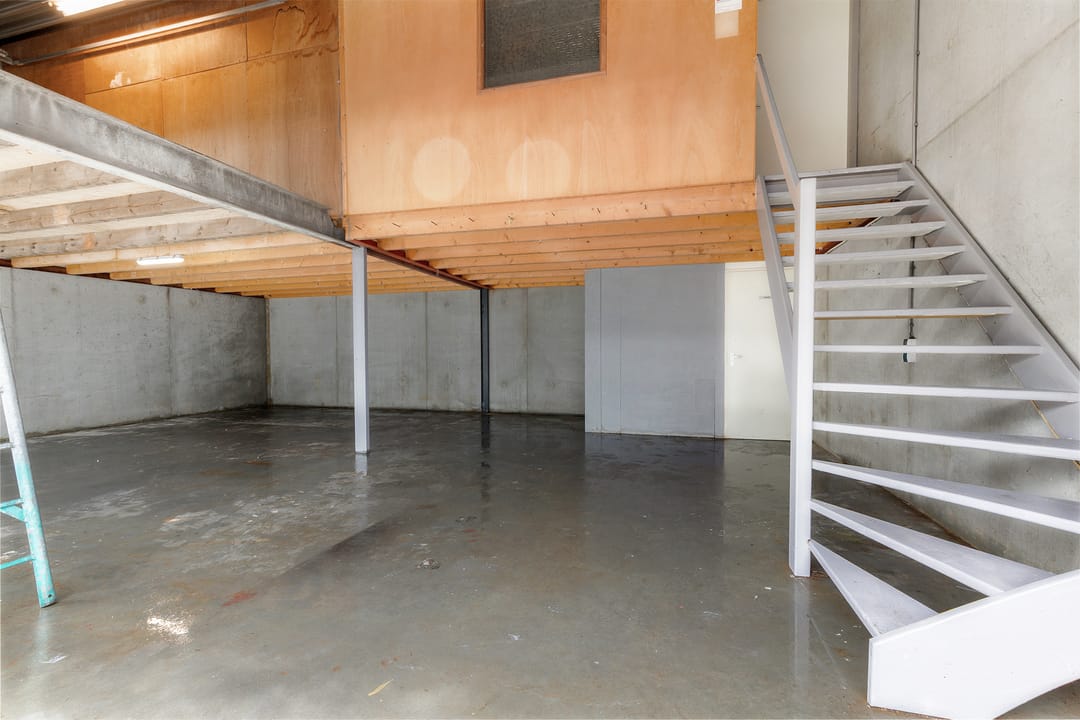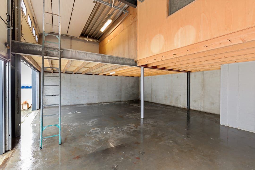 Entree met toegang tot de bedrijfsruimte. Ruime bedrijfsruimte met betonnen vloer en entresolvloer voor extra opslag. Meterkast en toiletruimte aanwezig.