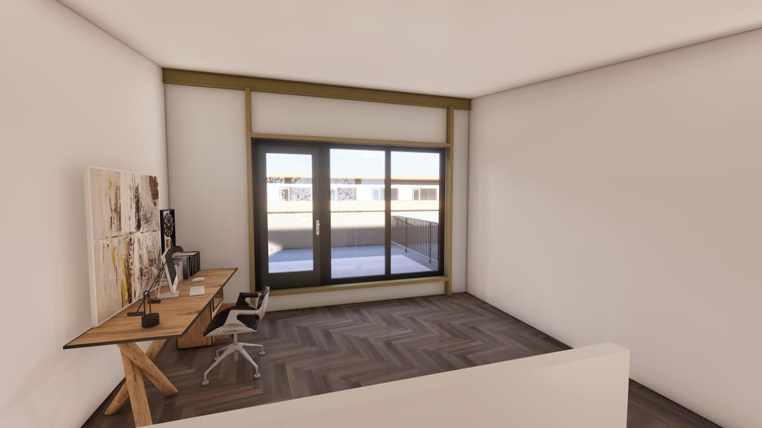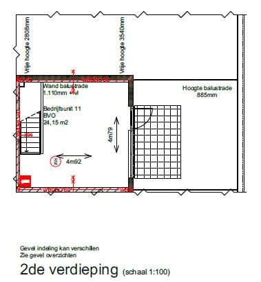 2e verdieping: ca. 22 m² kantoorruimte met dakterras (vrije hoogte ca. 2,80 m tot 3,50 m)