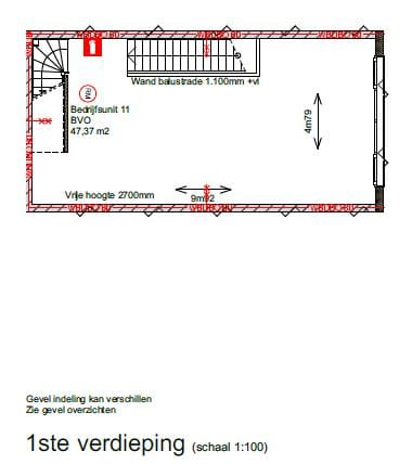 1e verdieping: ca. 47 m² kantoorruimte (vrije hoogte ca. 2,70 m)