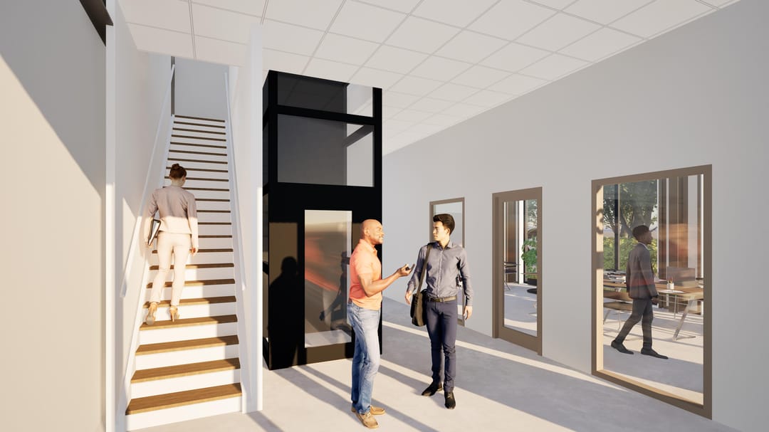 - Entree, trappenhuis en toiletten zijn afgewerkt, wanden kantoren zijn nog niet afgewerkt