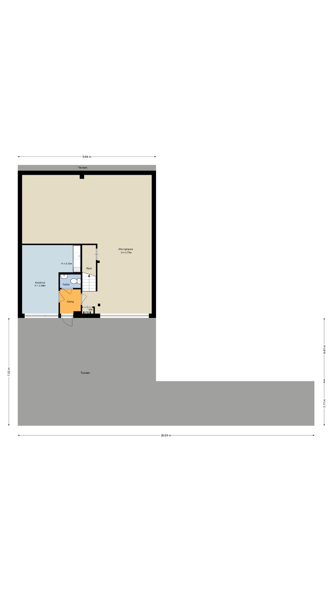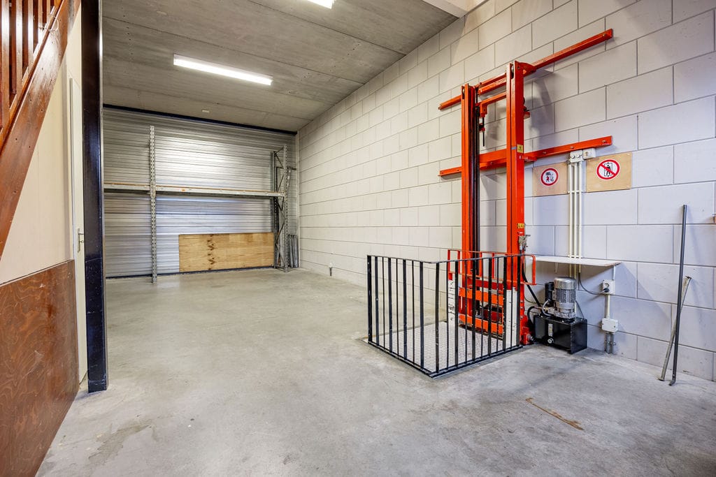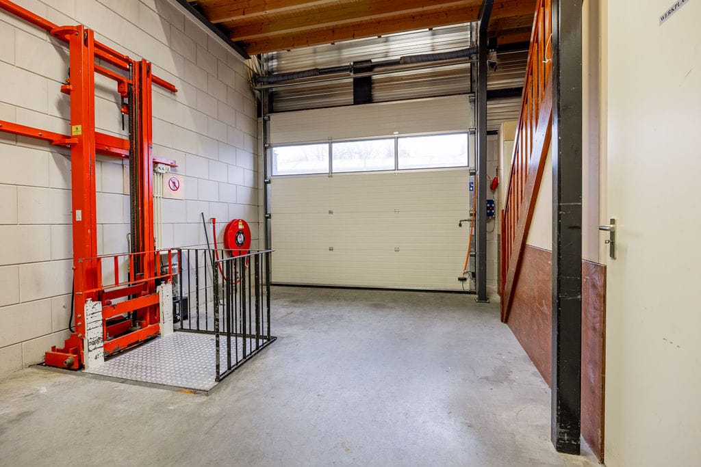 Begane grond: entree, hal met toilet, kantine met pantry. Royale werkplaats (ca 66 m2) met goederen lift.