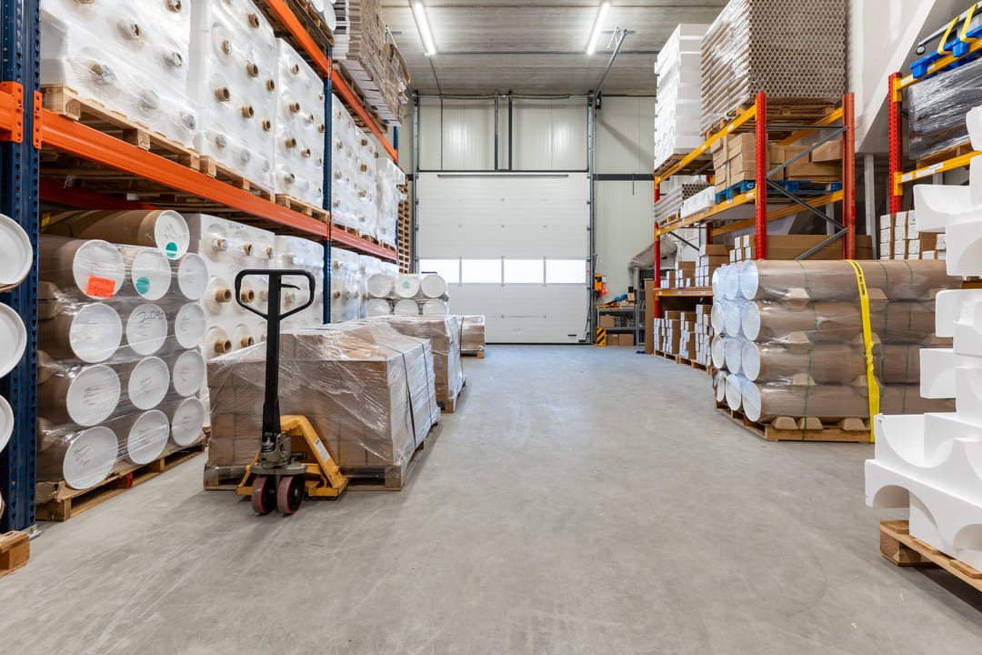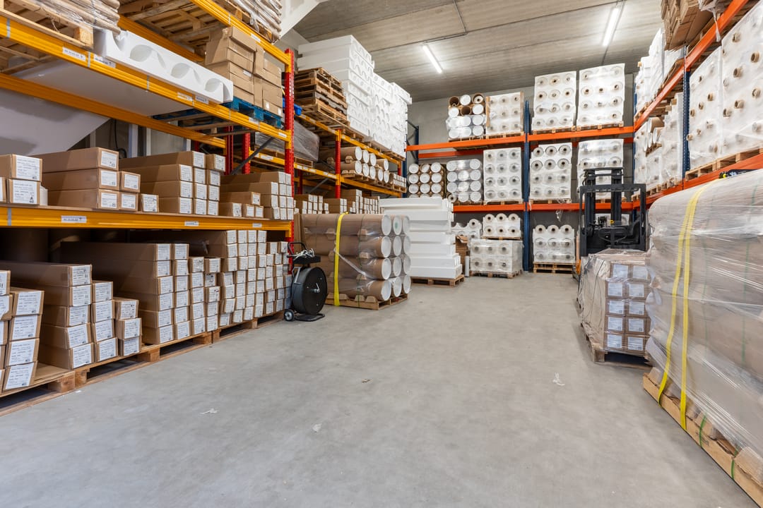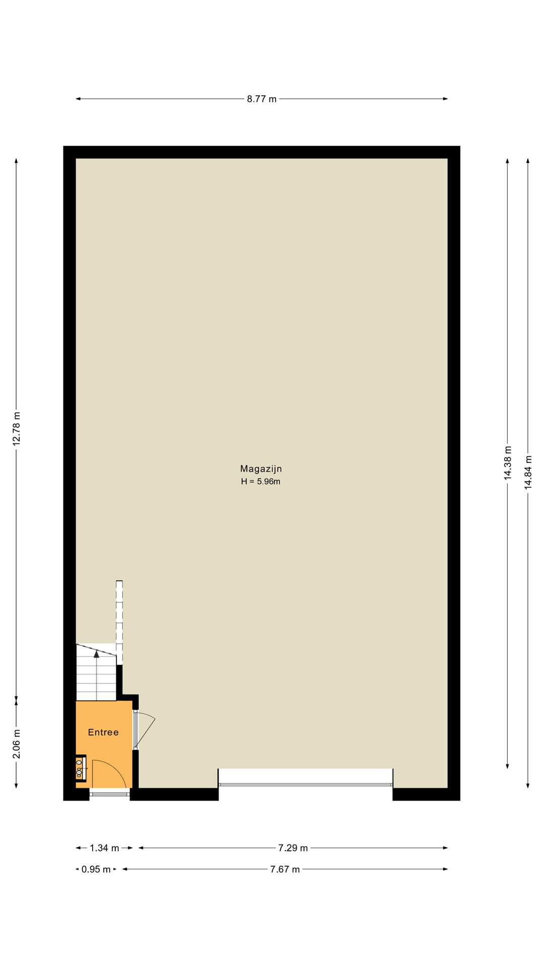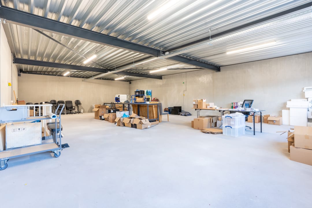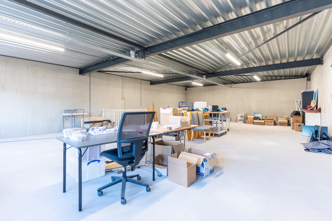 Via de entree met trapopgang kom je binnen in het magazijn (vrije hoogte van ca. 6 meter): een strakke, hoge bedrijfsruimte met goede lichtinval en een praktische overheaddeur. De ruimte is uitstekend geschikt voor opslag, productie, werkplaatsfuncties of logistieke activiteiten. Dankzij de hoogte en breedte kun je hier probleemloos met palletstellingen werken of een heftruck inzetten, zoals de huidige inrichting goed weergeeft.