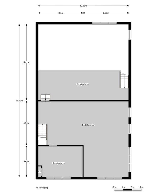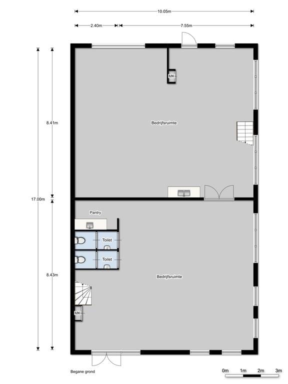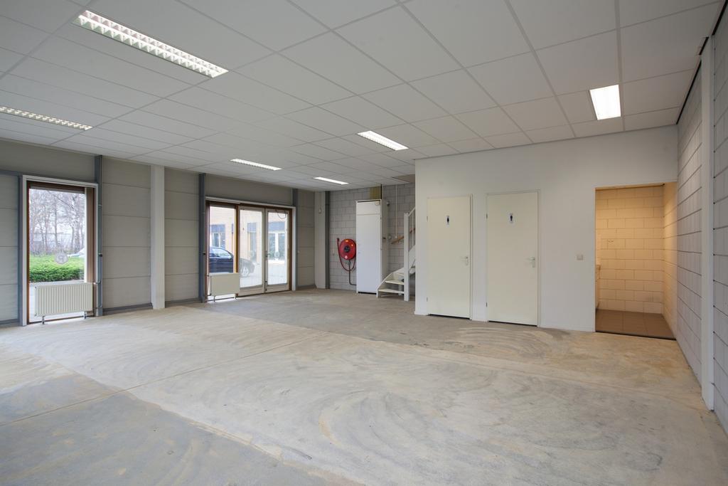 De begane grond bestaat uit twee ruimtes, waaronder een ruime bedrijfsruimte voorzien van een overheaddeur en een entresol voor extra opslag. Tevens bevinden hier ook twee toiletten en een pantry.
