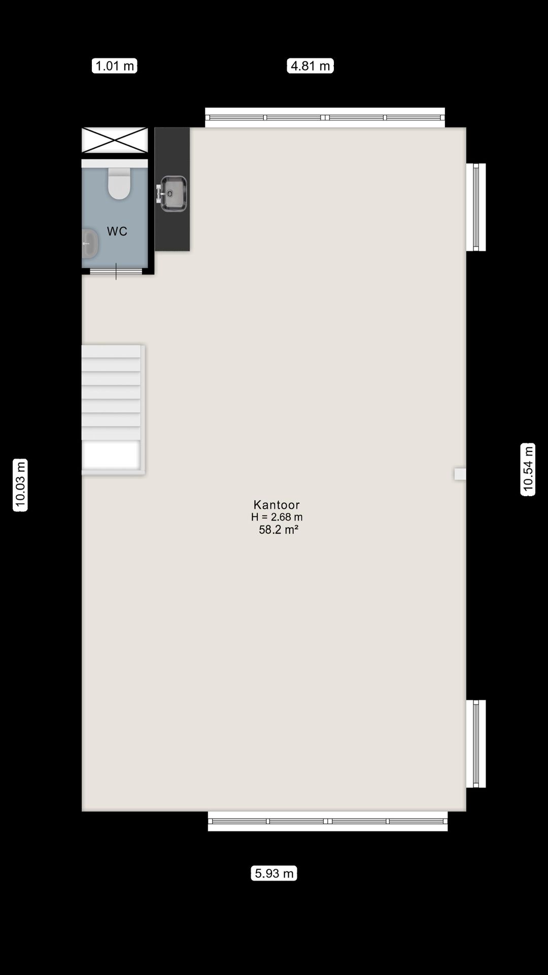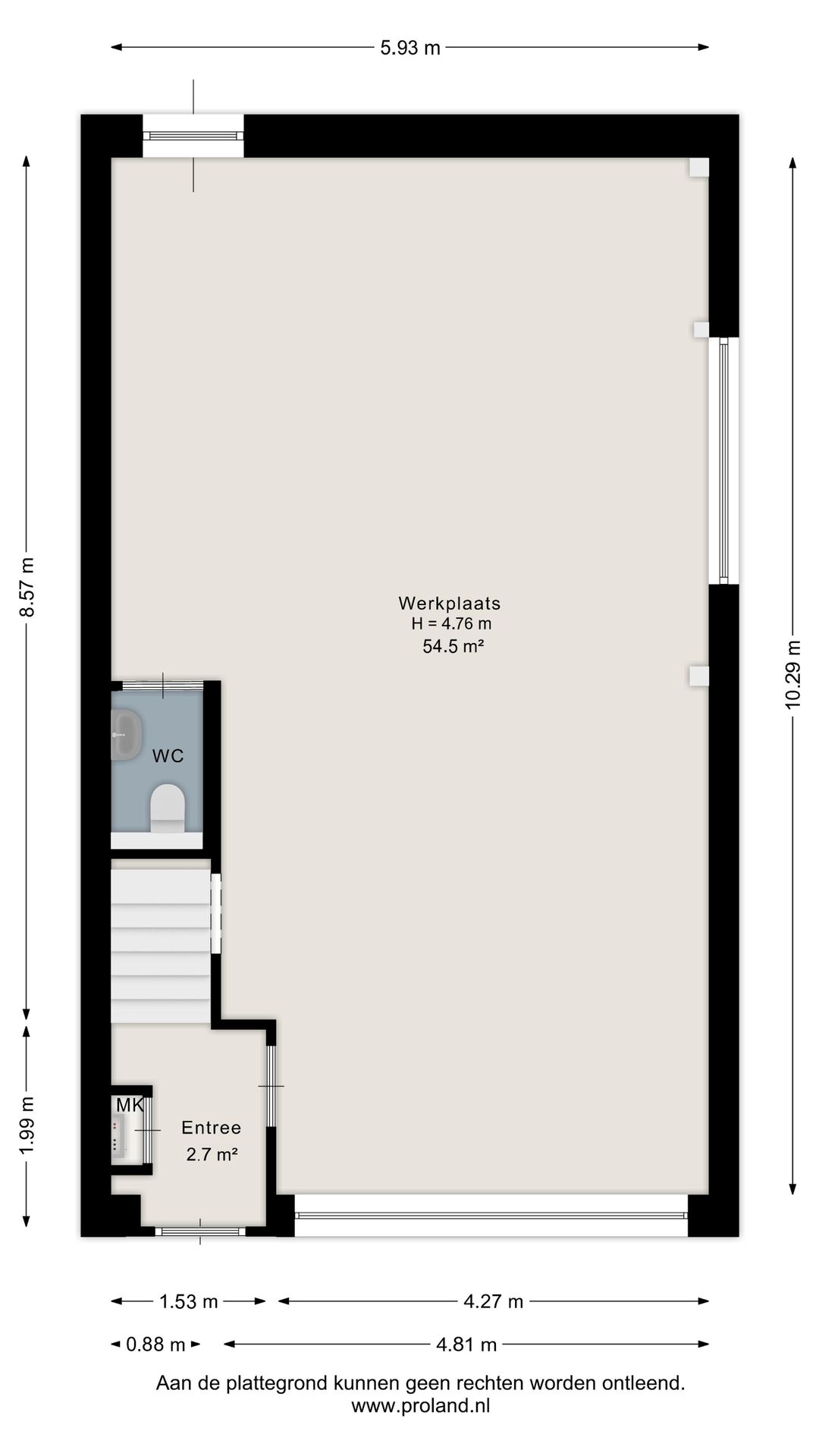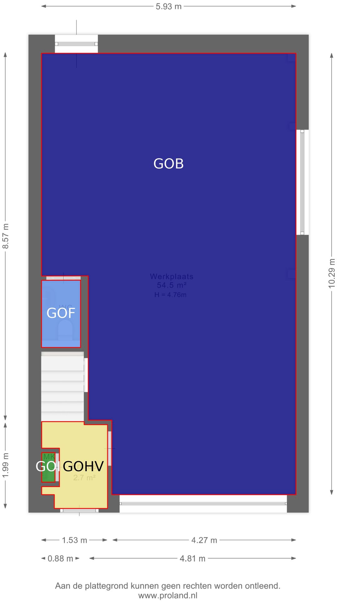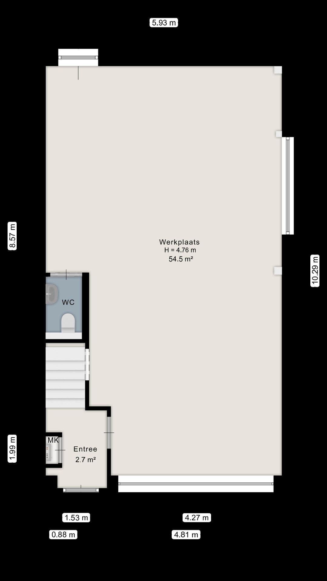 - Begane grond: ca. 59m² bedrijfsruimte, bereikbaar via de elektrische overheaddeur en aparte entree (ook aan achterzijde aanwezig). BVO 71m2